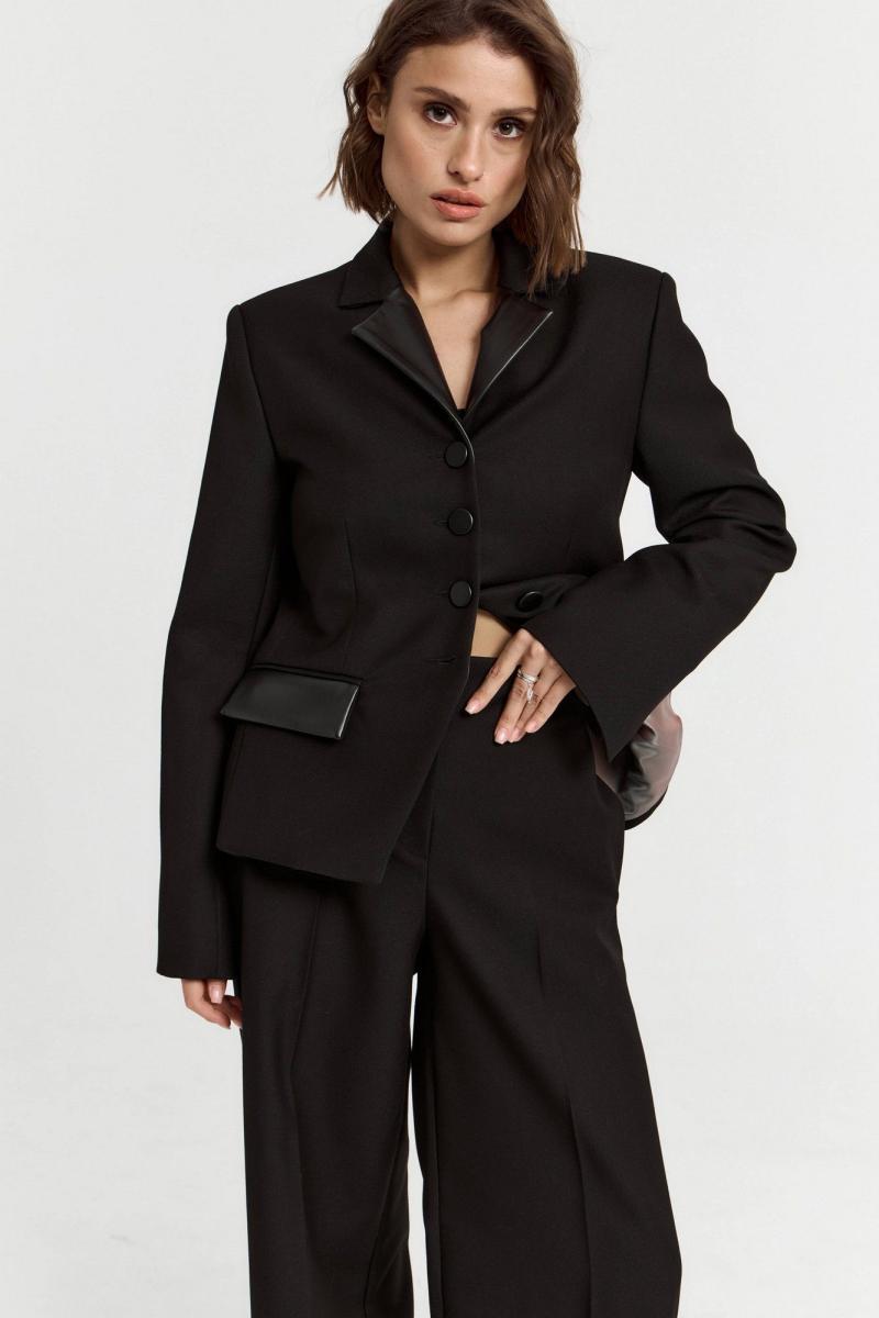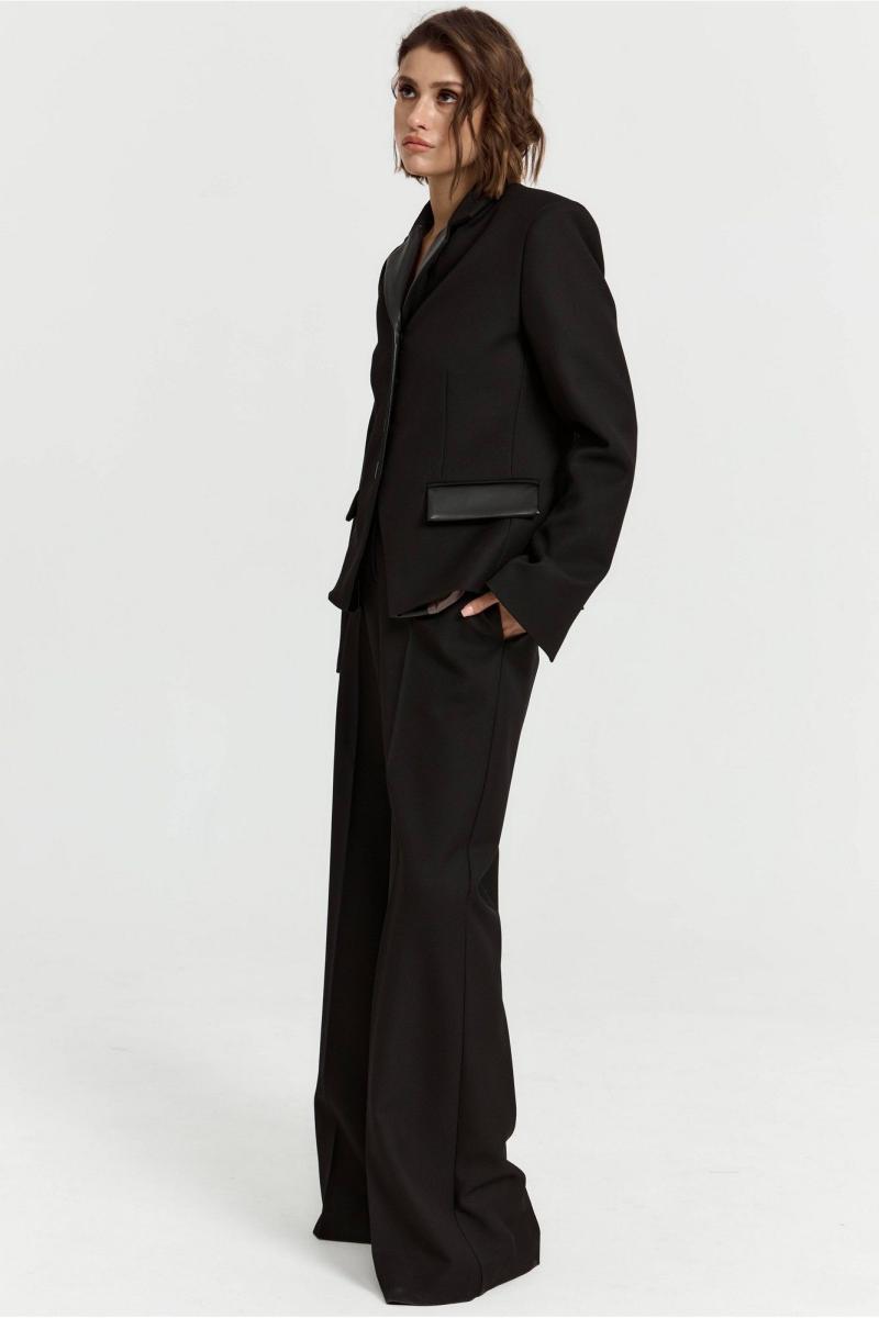 Брюки прямого свободного кроя выполнены из костюмной ткани. Пояс стабильный. Брюки приталенные, расширенные к низу. По передней части прошитые швы. Длина брюк 114