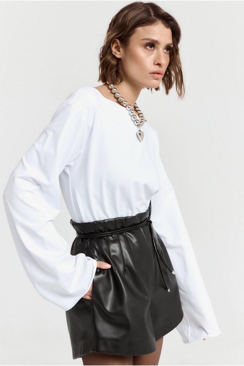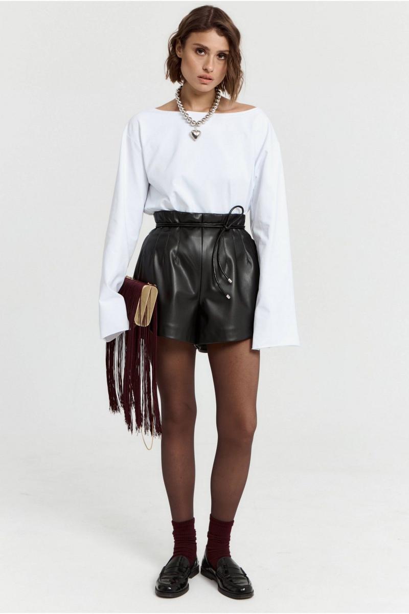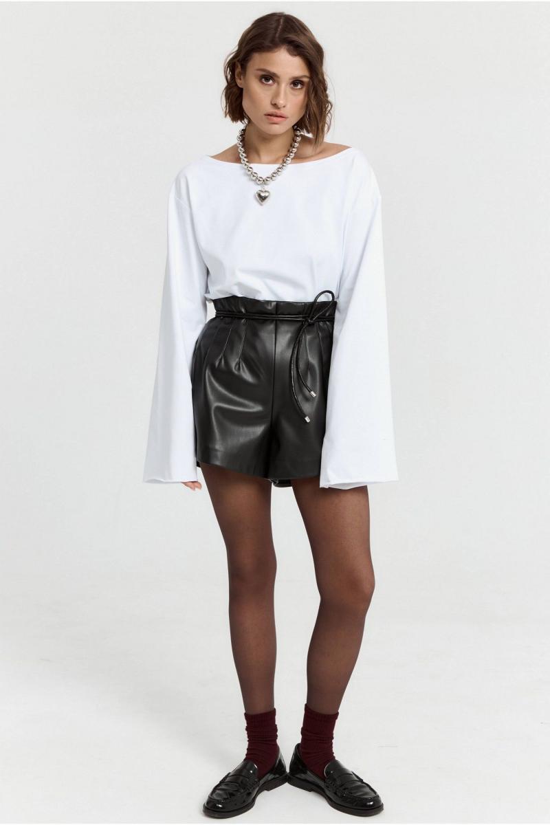 Шорты в длине мини из экокожи. Посадка высокая, по талии декоративные выточки, потайная молния по спинке изделия. Длина по спинке 42.