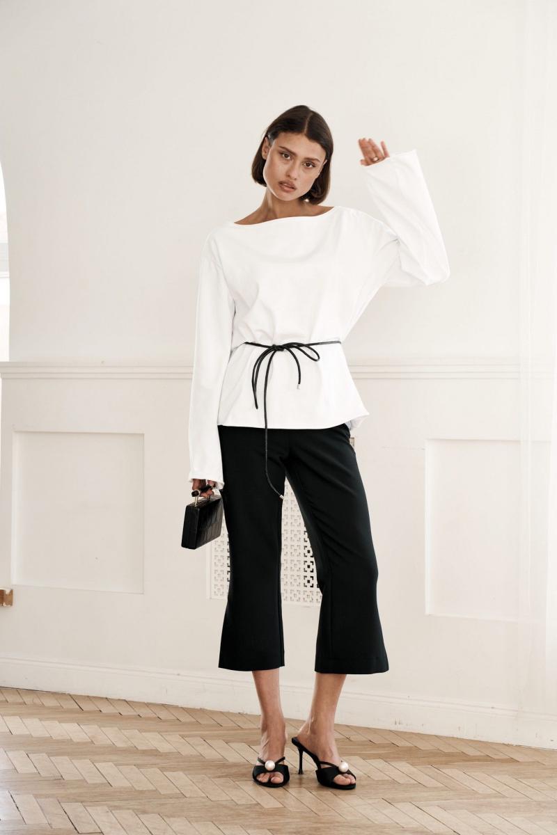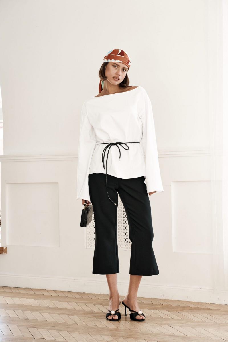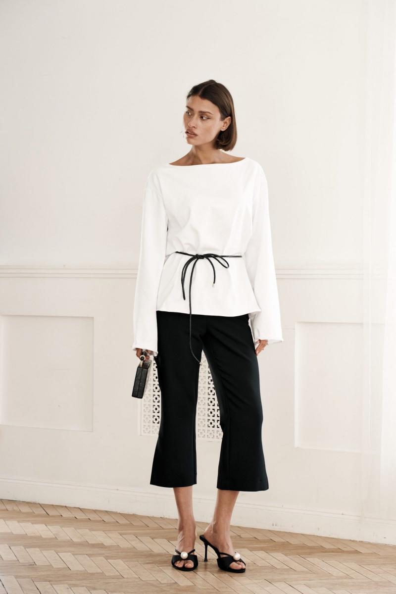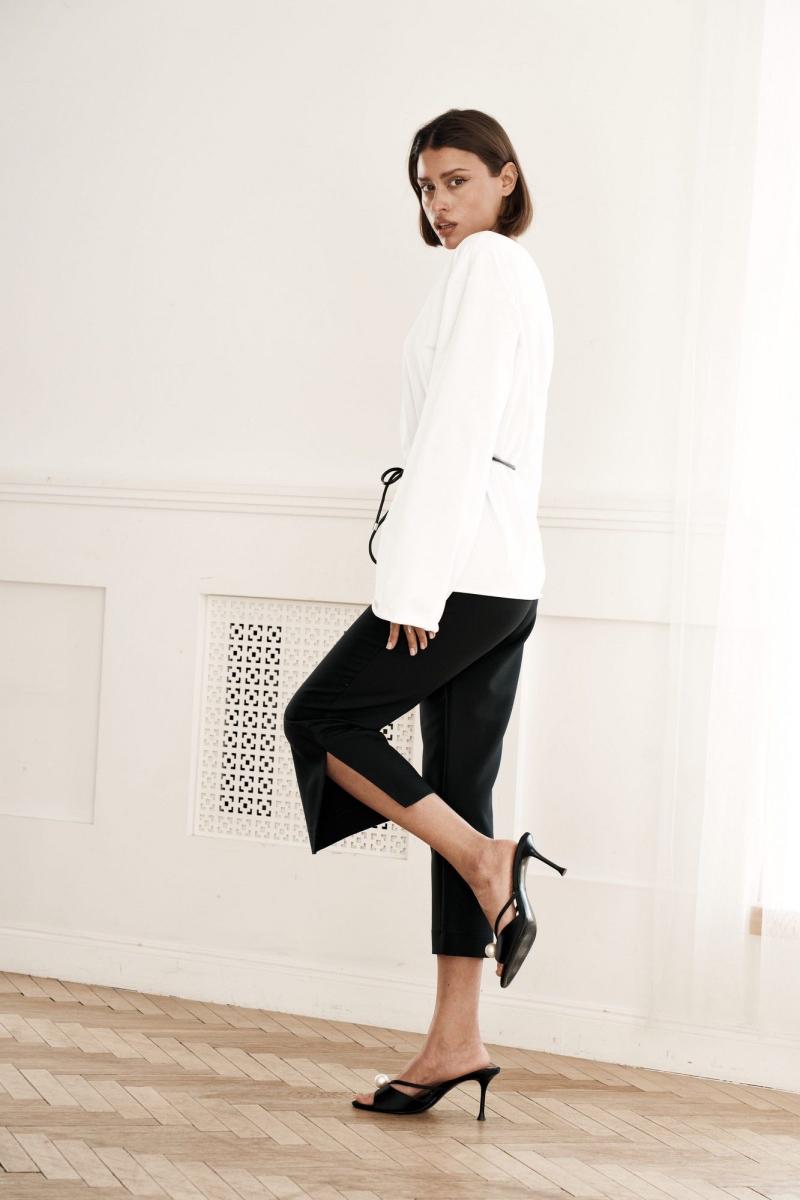 Брюки прямого силуэта, на поясе, из костюмной ткани, высокая посадка, брюки укороченные с разрезами по низу изделия. Застежка на потайную молнию в боковом шве.