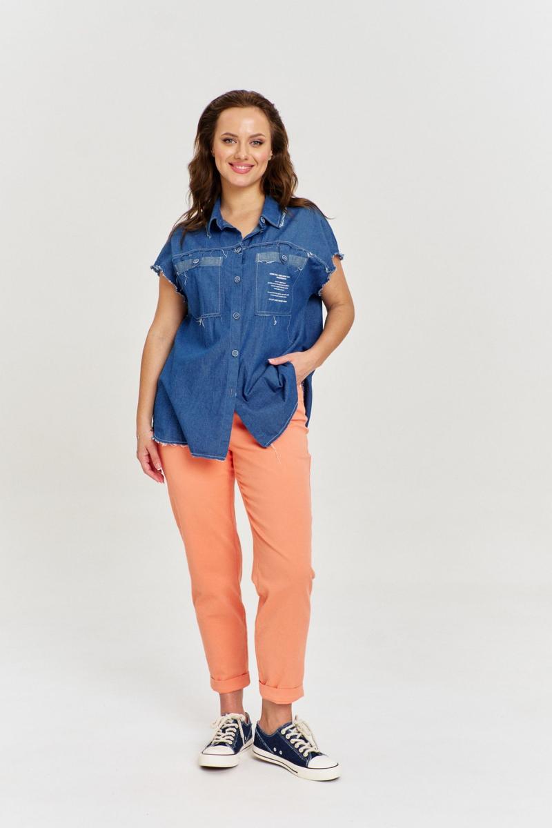 Брюки из хлопкового джинса со стрейчем , с четырьмя функциональными карманами и одним отделочным карманом. Пояс на резинке, с кулисой и шнуром. Изделие декорировано металлическими хольнитенами и контрастными отделочными строчками.