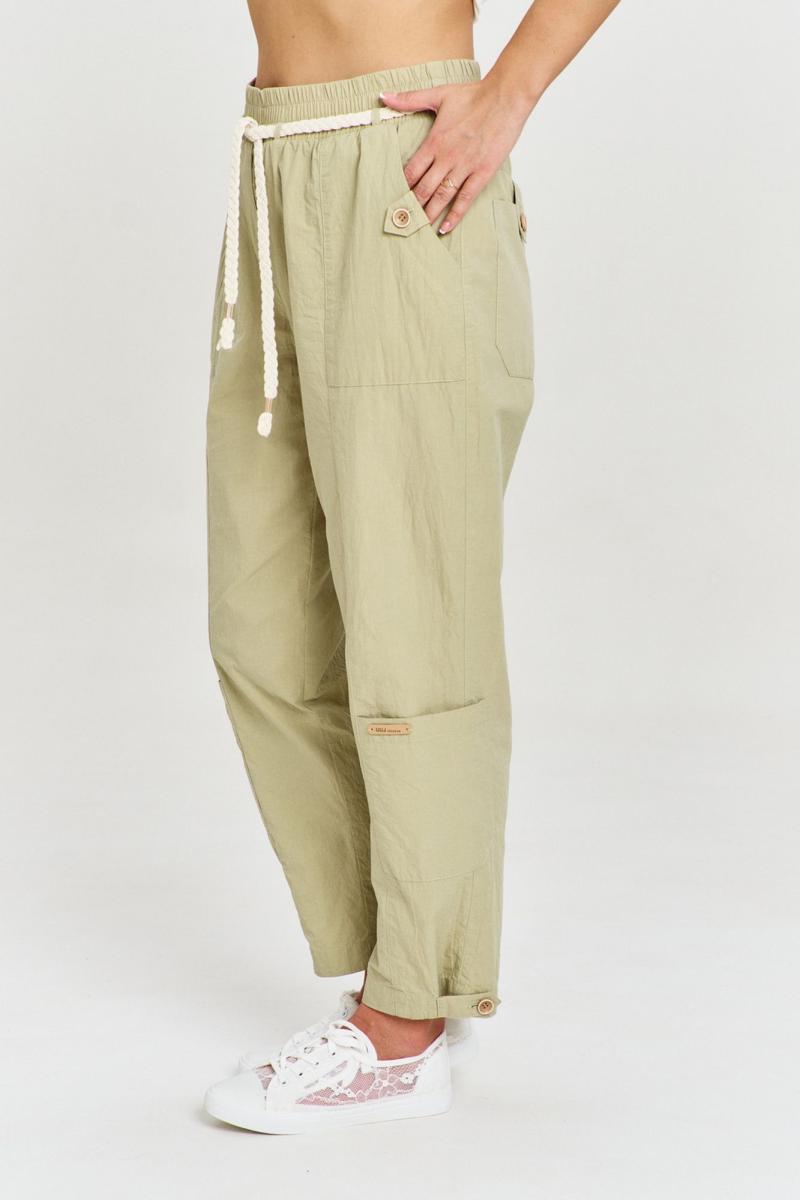 Брюки из 100% хлопковой ткани с легким крэш эффектом, свободного силуэта, зауженные к низу. В изделии шесть функциональных карманов, декорированных хлястиками с пуговицами. Пояс на резинке, с декоративным хлопковым шнуром. Ширина брюк внизу регулируется с помощью хлястика.