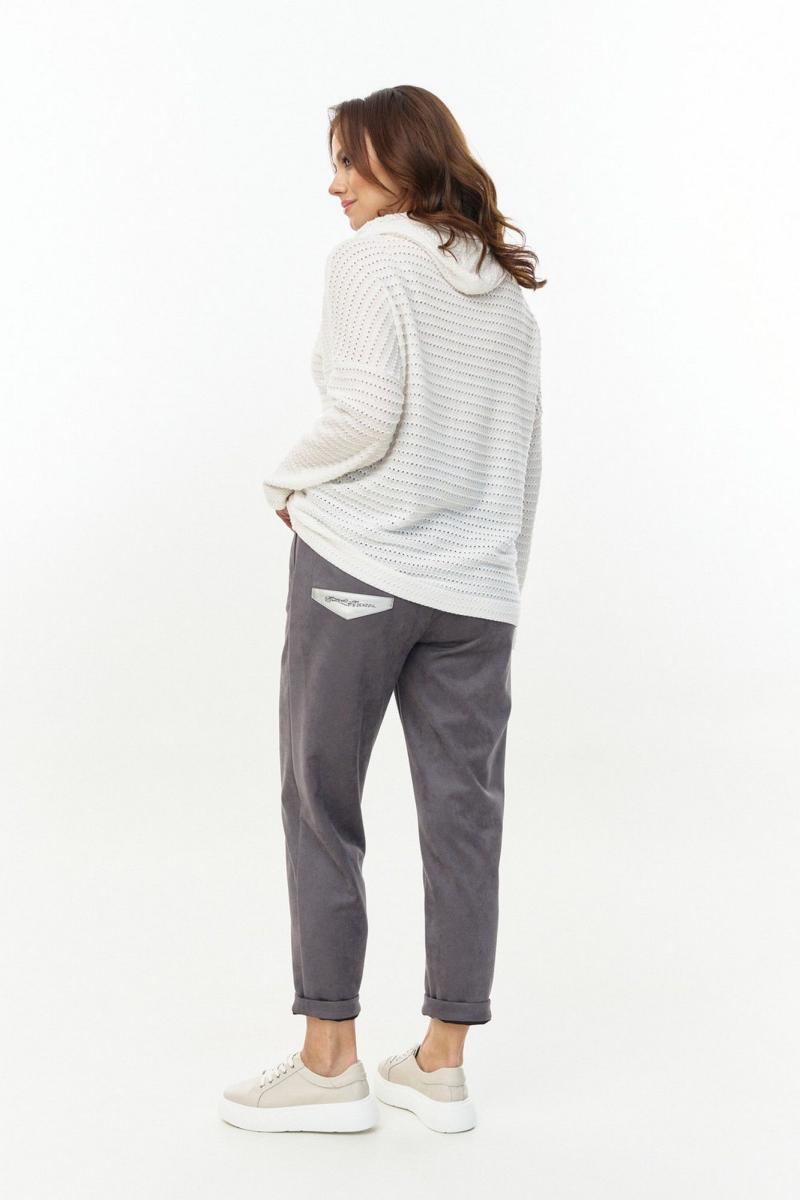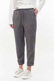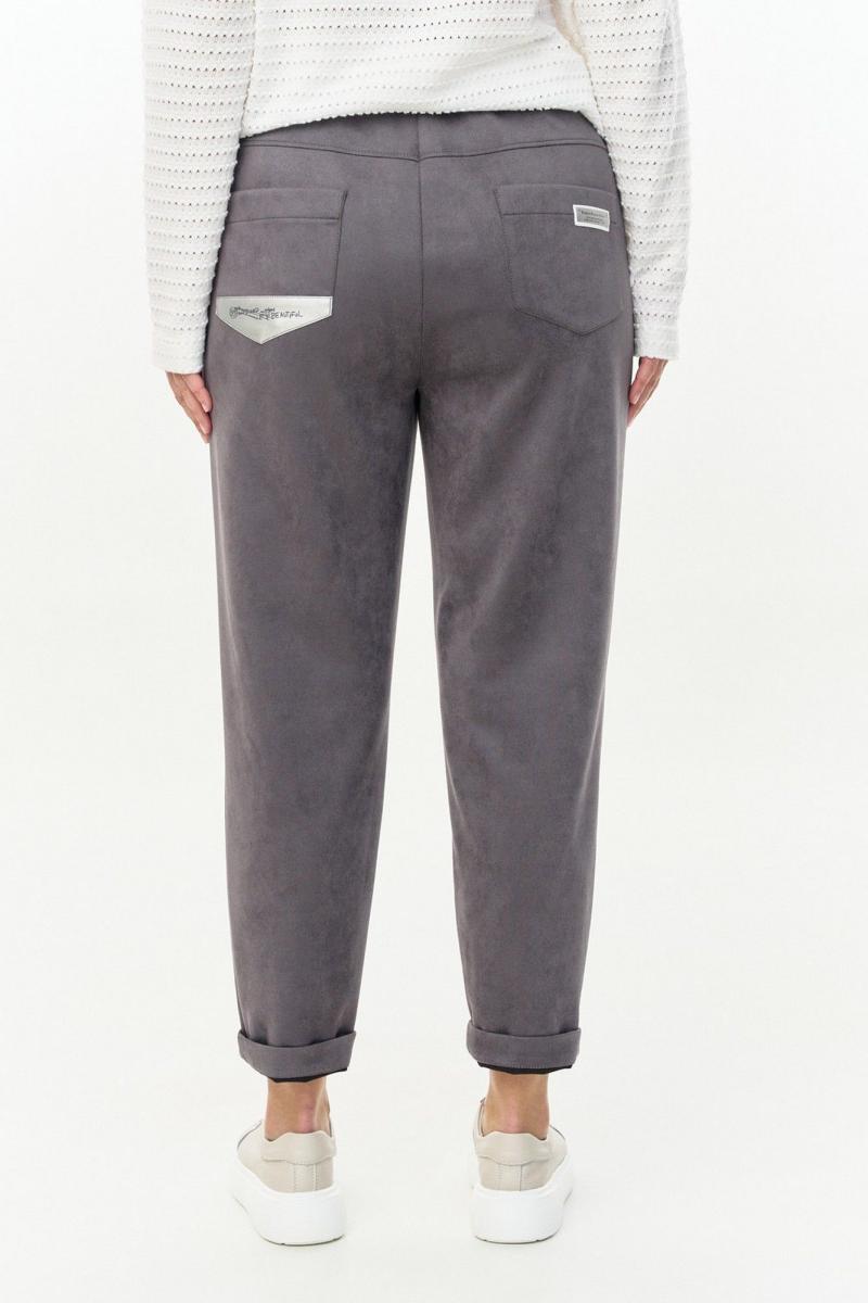 Брюки из экозамши на плотной трикотажной основе, с четырьмя функциональными карманами и трикотажным поясом на резинке, с кулисой и шнуром. Изделие декорировано авторскими нашивками на серебристой коже.