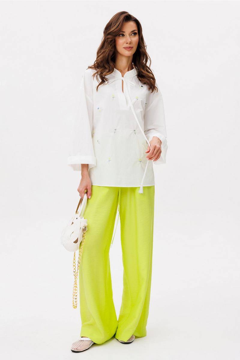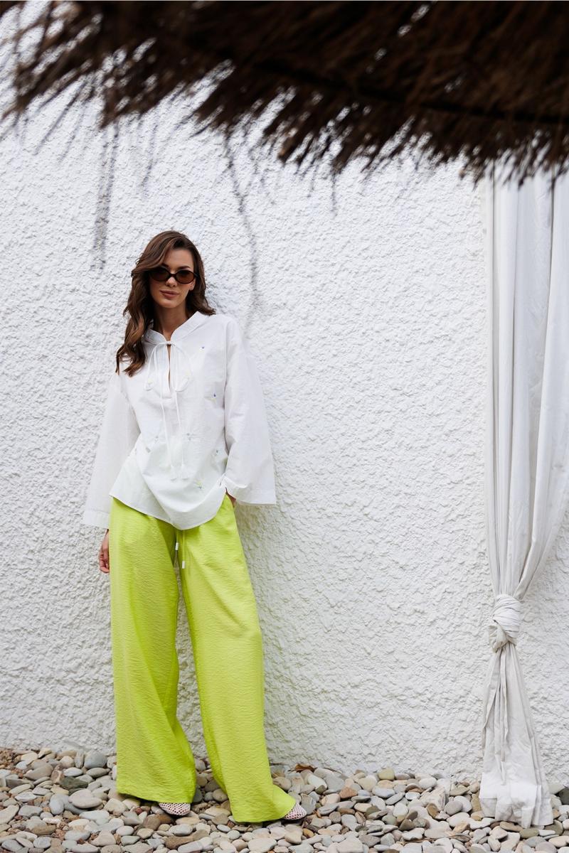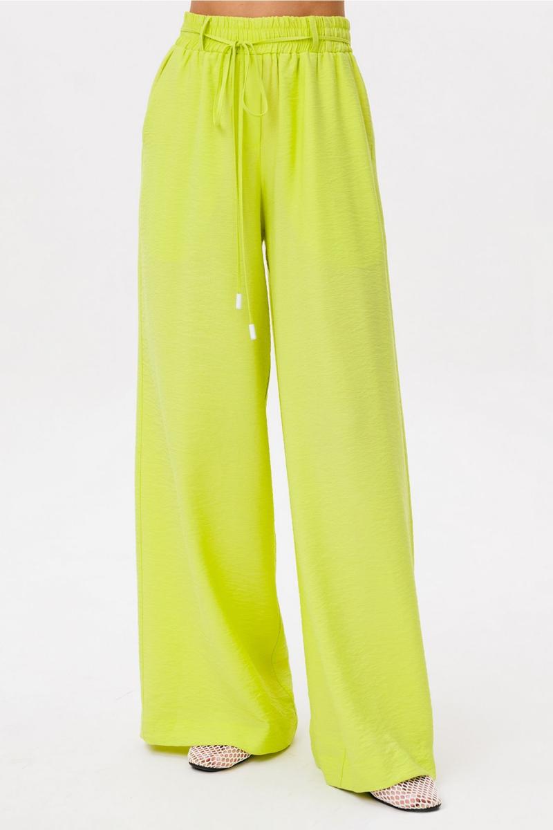 Брюки, немного расширенные к низу, на притачном, отстроченном поясе на резинке со шлевками, в которые втянут шнурок из основной ткани с наконечниками. По переду карманы в боковых швах с наклонным входом.