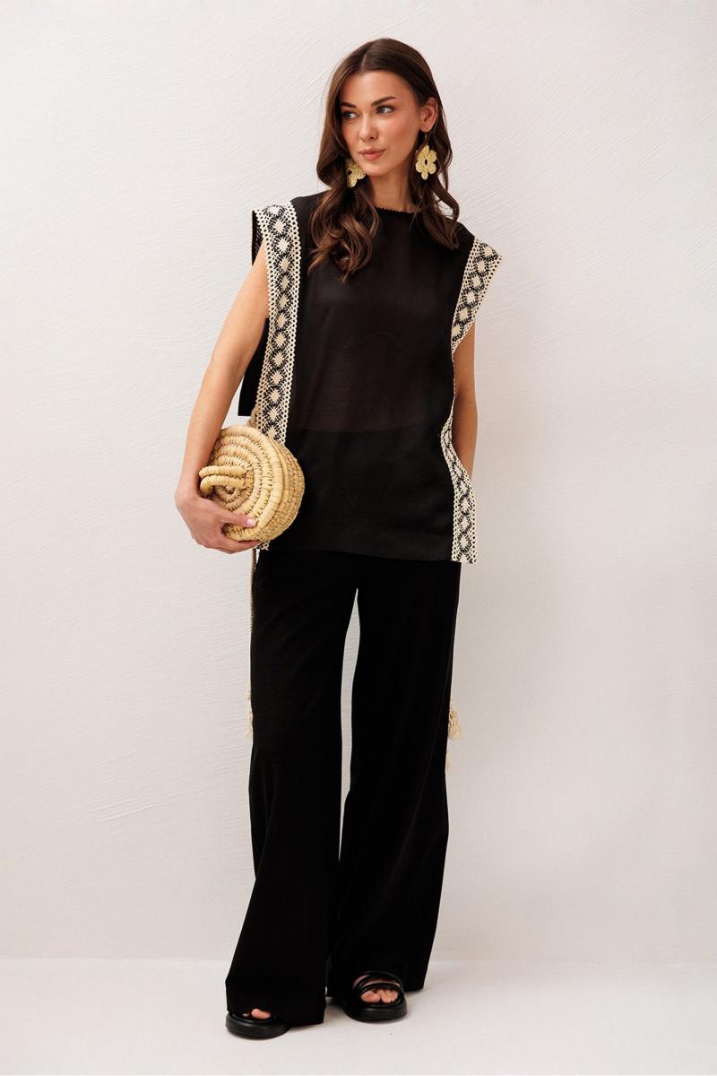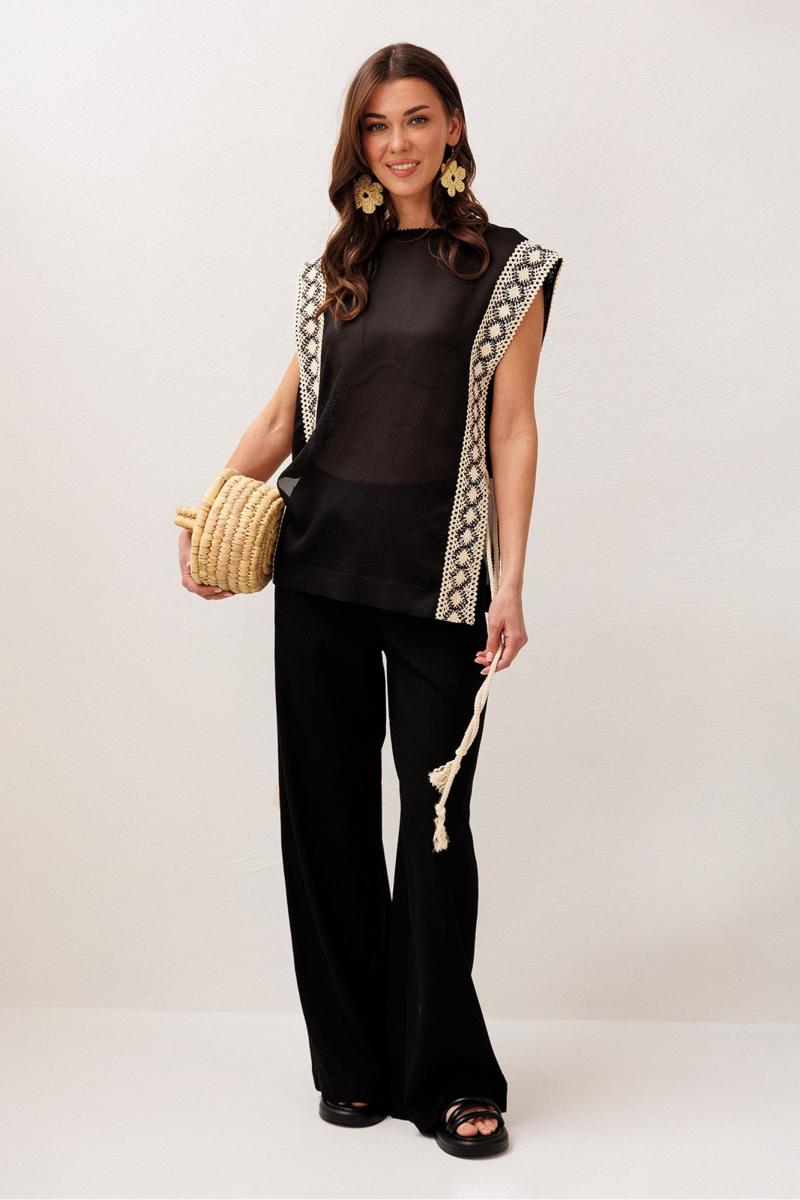 Брюки немного расширенные к низу, на притачном, отстроченном поясе на резинке, с карманами в боковых швах. Вверху по переду имитация застежки-гульфик.