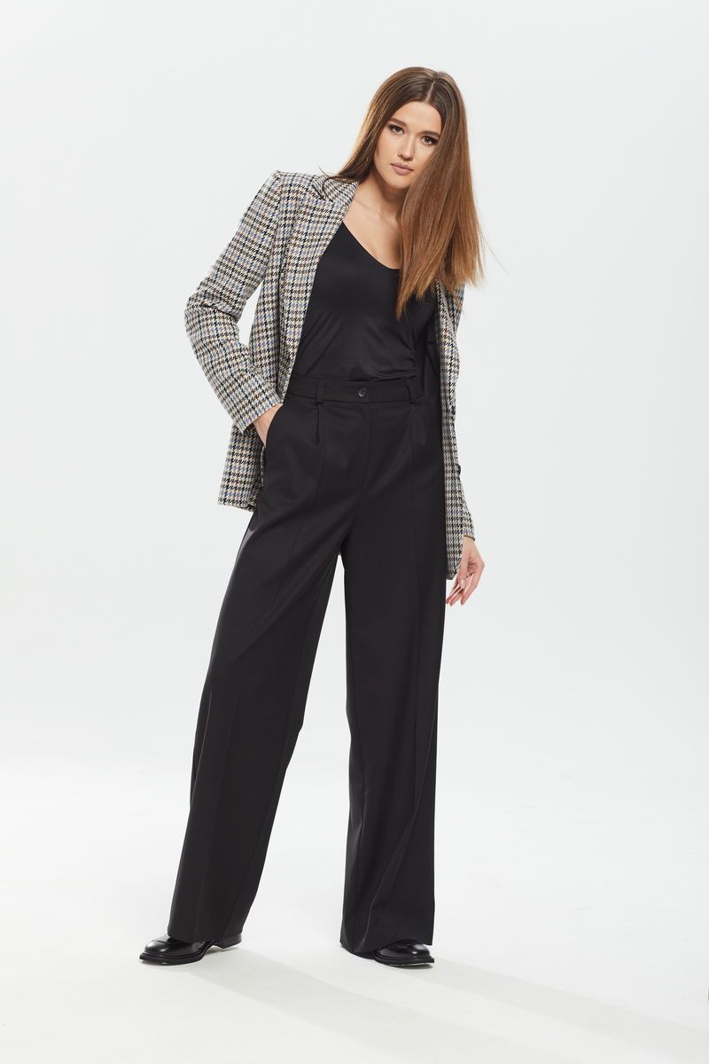 Брюки прямого силуэта, верх брюк обработан притачным поясом . В верхней части брюк расположены карманы .