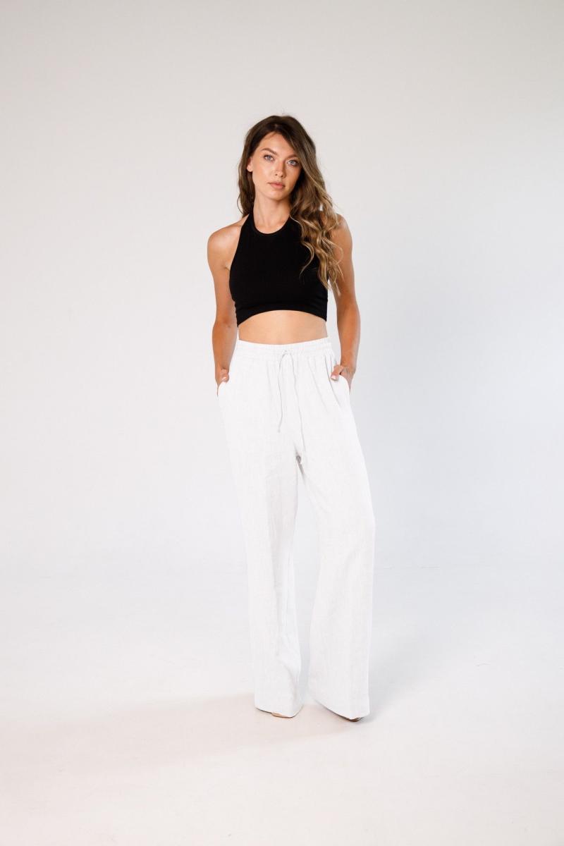 Брюки прямого свободного силуэта, верх брюк обработан притачным пясом с резинкой и кулисой. В верхней части брюк расположены карманы.