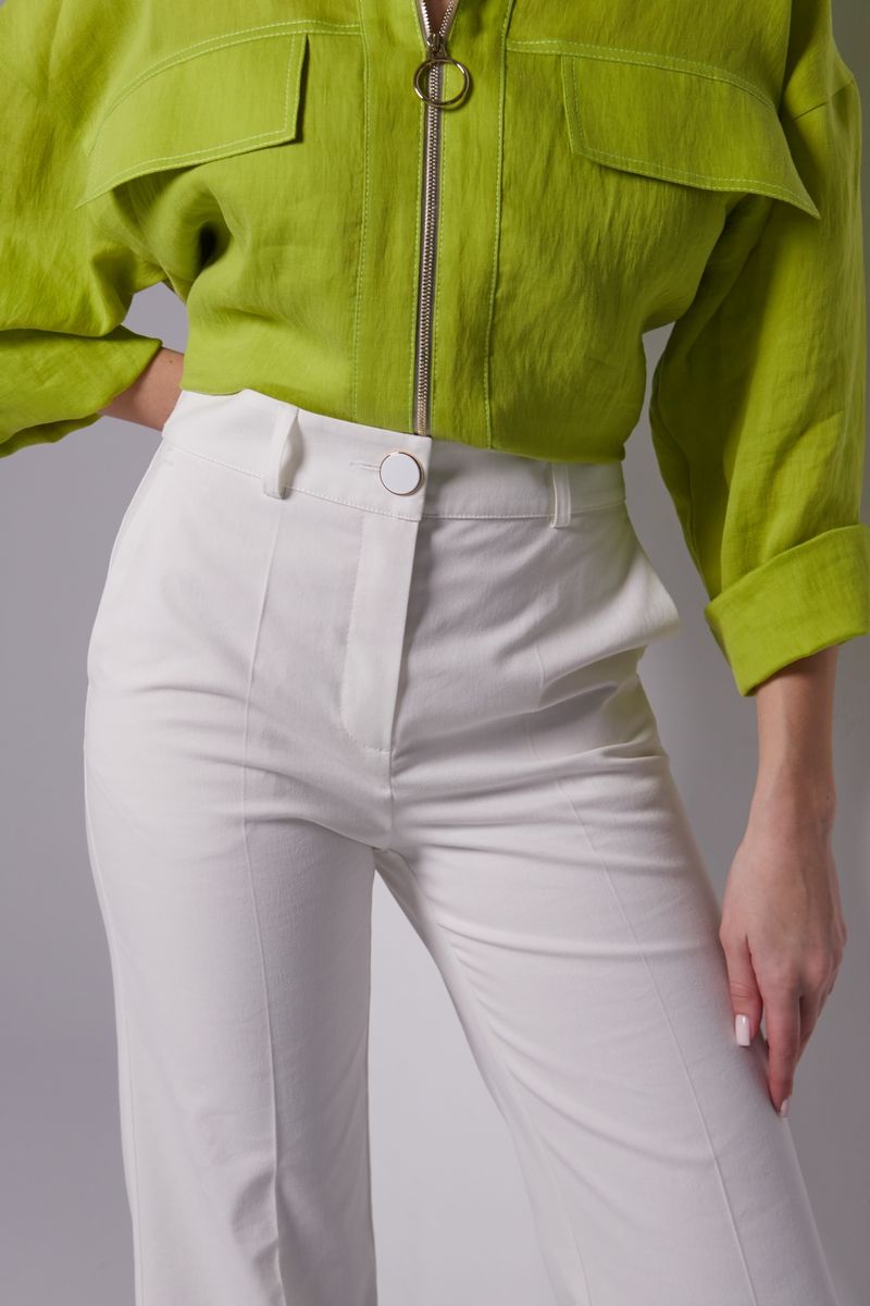 Брюки из тонкого джинса, с посадкой на талии, полуприлегающие по бёдрам, прямые от середины бедра до линии колена и слегка расширены от колена до низа. Брюки длиной до щиколотки с имитацией широких манжет. Передние половинки с карманами, наклонными к боковым швам, с застёжкой на тесьму-молнию в среднем шве. Задние половинки с талиевыми вытачками, с нефункциональными карманами с листочкой. Пояс с застёжкой на петлю и пуговицу, с эластичной тесьмой по спинке, с пятью шлёвками для съёмного пояса. По верхнему краю манжет прострочена отделочная строчка, эластичная тесьма в поясе закреплена двумя параллельными строчками. По боковым швам, частично прострочена отделочная строчка с закрепкой в нижней части кармана. По передним и задним половинкам заутюжены стрелки.
