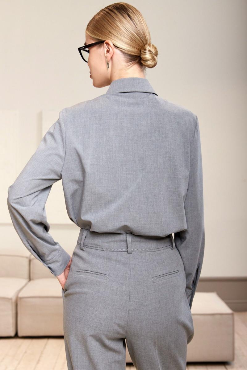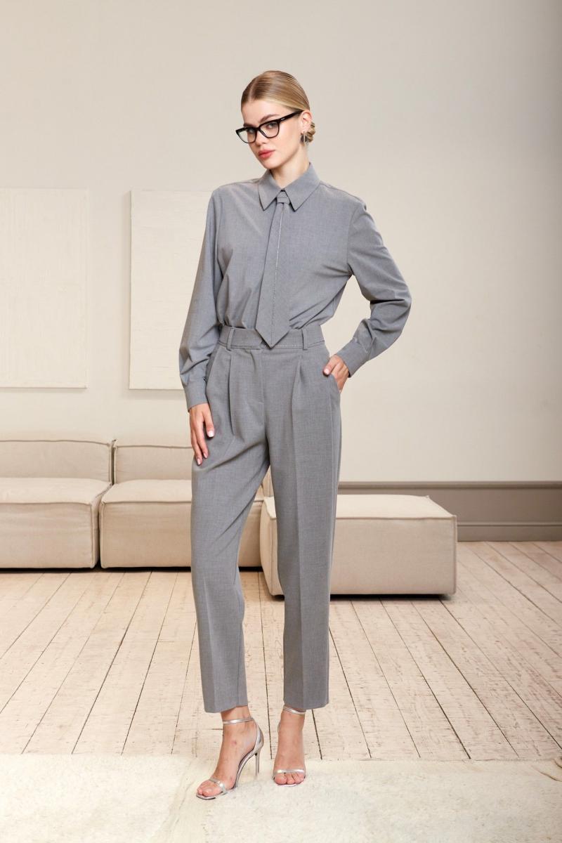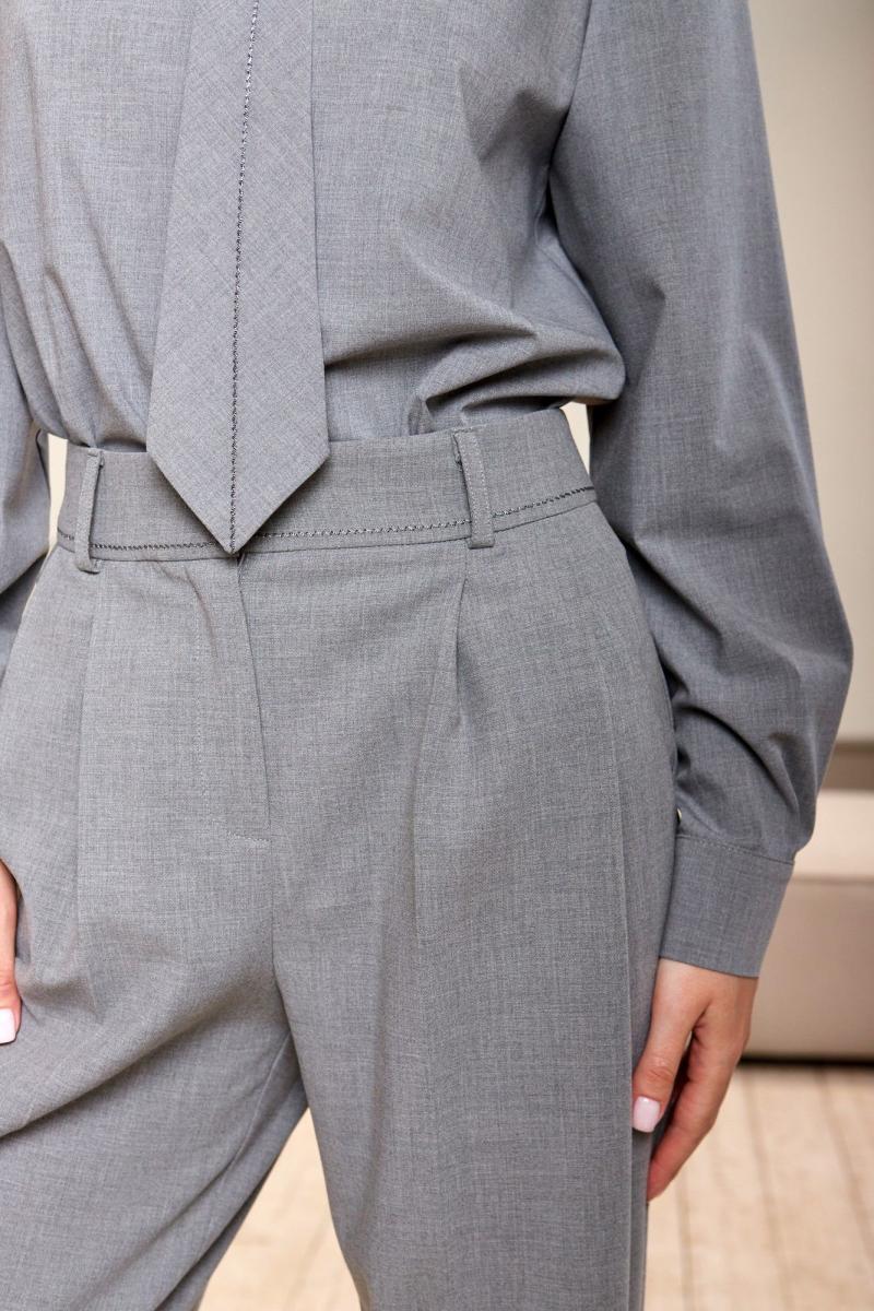 Брюки с посадкой на талии, длиной до щиколотки, полуприлегающего силуэта, с двумя парами складок по переду, заужены к низу. Передние половинки с карманами, наклонными к боковым швам, ребро второй складки перекрывает начало кармана. В среднем шве застёжка на тесьму-молнию, обработана гульфиком и откоском. Задние половинки с двумя парами талиевых вытачек, с прорезными нефункциональными карманами с листочкой. Пояс-обтачка с застёжкой на крючок и потайную пуговицу, с пятью шлёвками для съёмного пояса. По передним и задним половинкам заутюжены стрелки. По листочкам и поясу проложена декоративная строчка люрексовой ниткой.