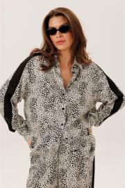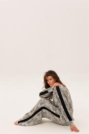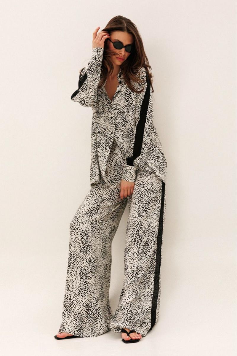 Брюки широкие с притачным поясом на резинке и карманами по боковым швам. Ломпас выполнен из шифона.