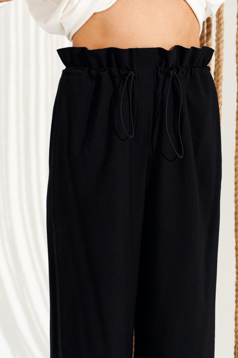 Брюки свободного объема, прямого силуэта. Перед с имитацией гульфика. Пояс цельнокроеный, с отделочными строчками, образующими кулиску, в которую продет эластичный шнур с фиксаторами. Для регулировки объема нижний срез оформлен кулиской с эластичным шнуром и фиксатором. Длина изделия на модели вдоль бокового шва с учетом пояса — 111 см (допустимое отклонение +/- 1 см)