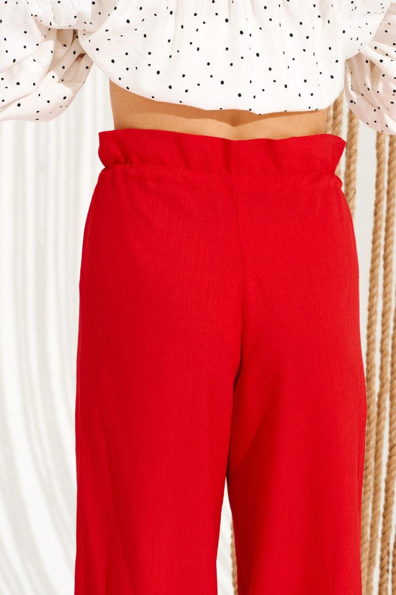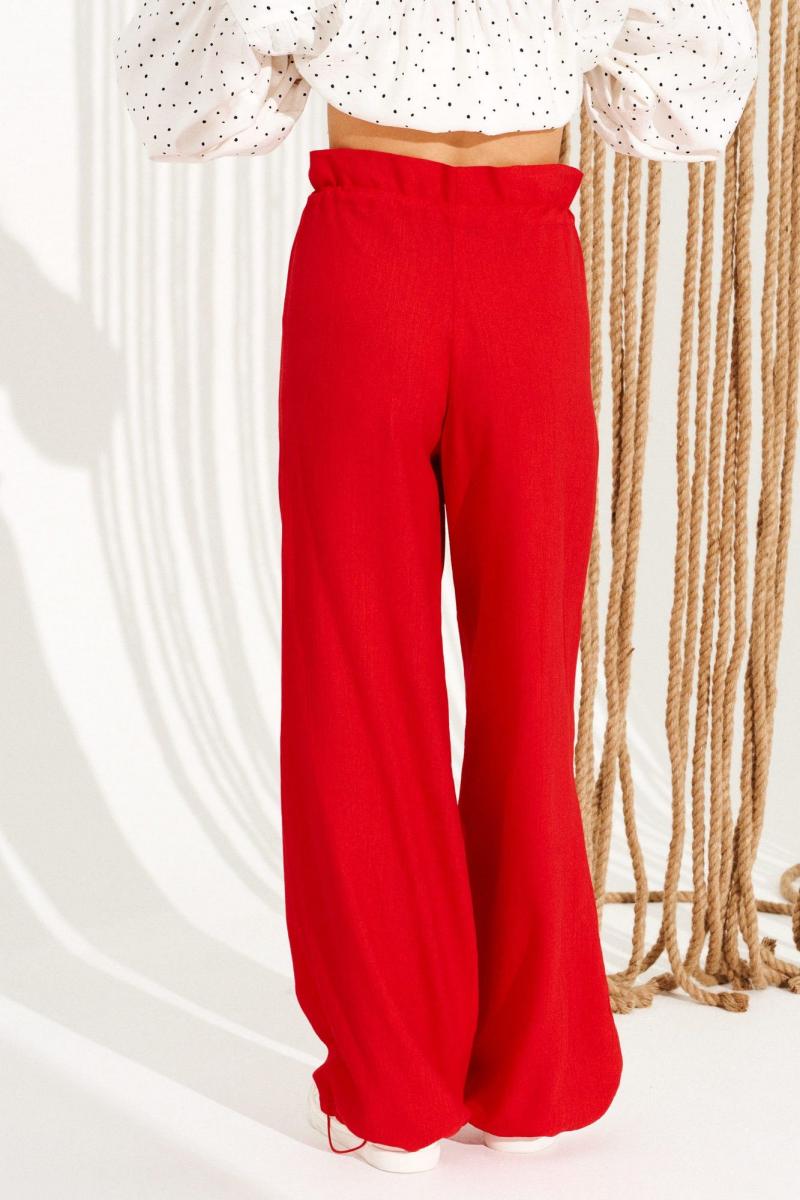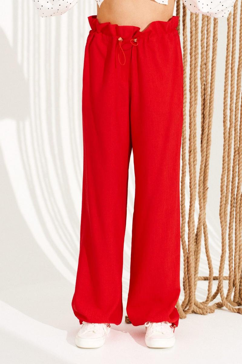 Брюки свободного объема, прямого силуэта. Перед с имитацией гульфика. Пояс цельнокроеный, с отделочными строчками, образующими кулиску, в которую продет эластичный шнур с фиксаторами. Для регулировки объема нижний срез оформлен кулиской с эластичным шнуром и фиксатором. Длина изделия на модели вдоль бокового шва с учетом пояса — 111 см (допустимое отклонение +/- 1 см)