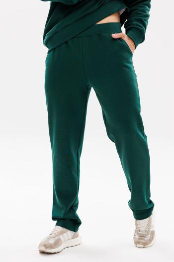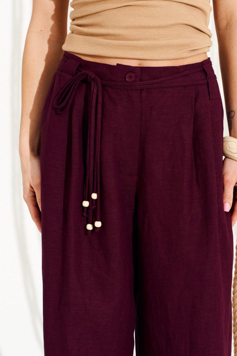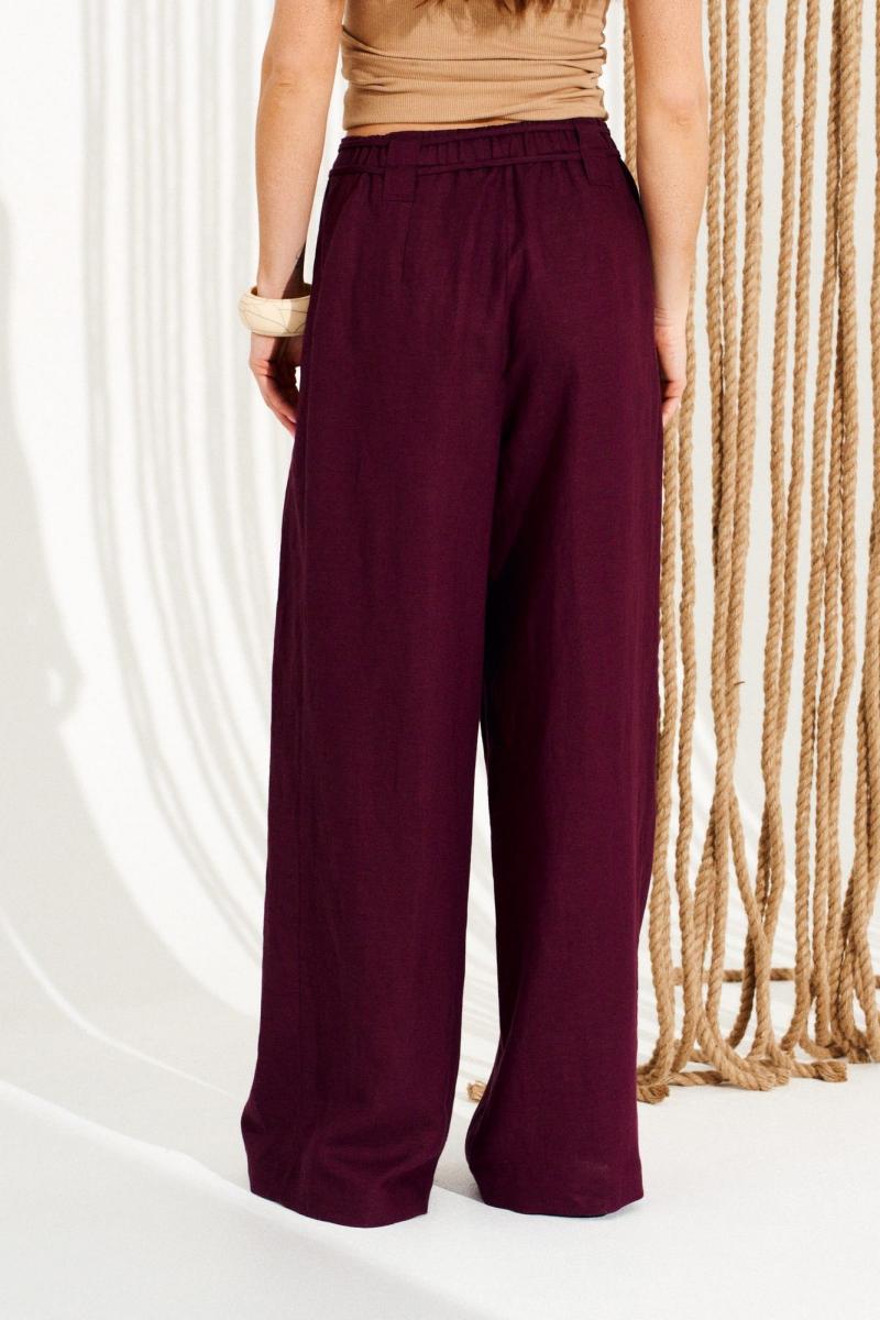 Брюки свободного объема, слегка расширены книзу. На передних половинках выполнены боковые карманы с отрезным бочком и односторонние складки. На задних половинках выполнены талиевые вытачки. Застежка — гульфик на молнии. Пояс притачной, с резинкой по спинке, застежкой на петлю и пуговицу и двойными шлевками. В шлевки продеты декоративные шнуры-завязки с наконечниками. Длина изделия на модели вдоль бокового шва с учетом пояса — 110,5 см (допустимое отклонение +/- 1 см)
