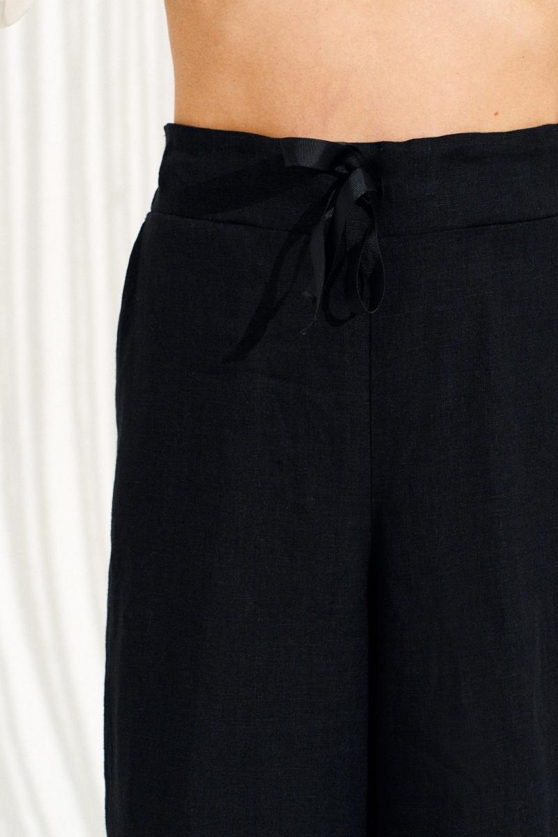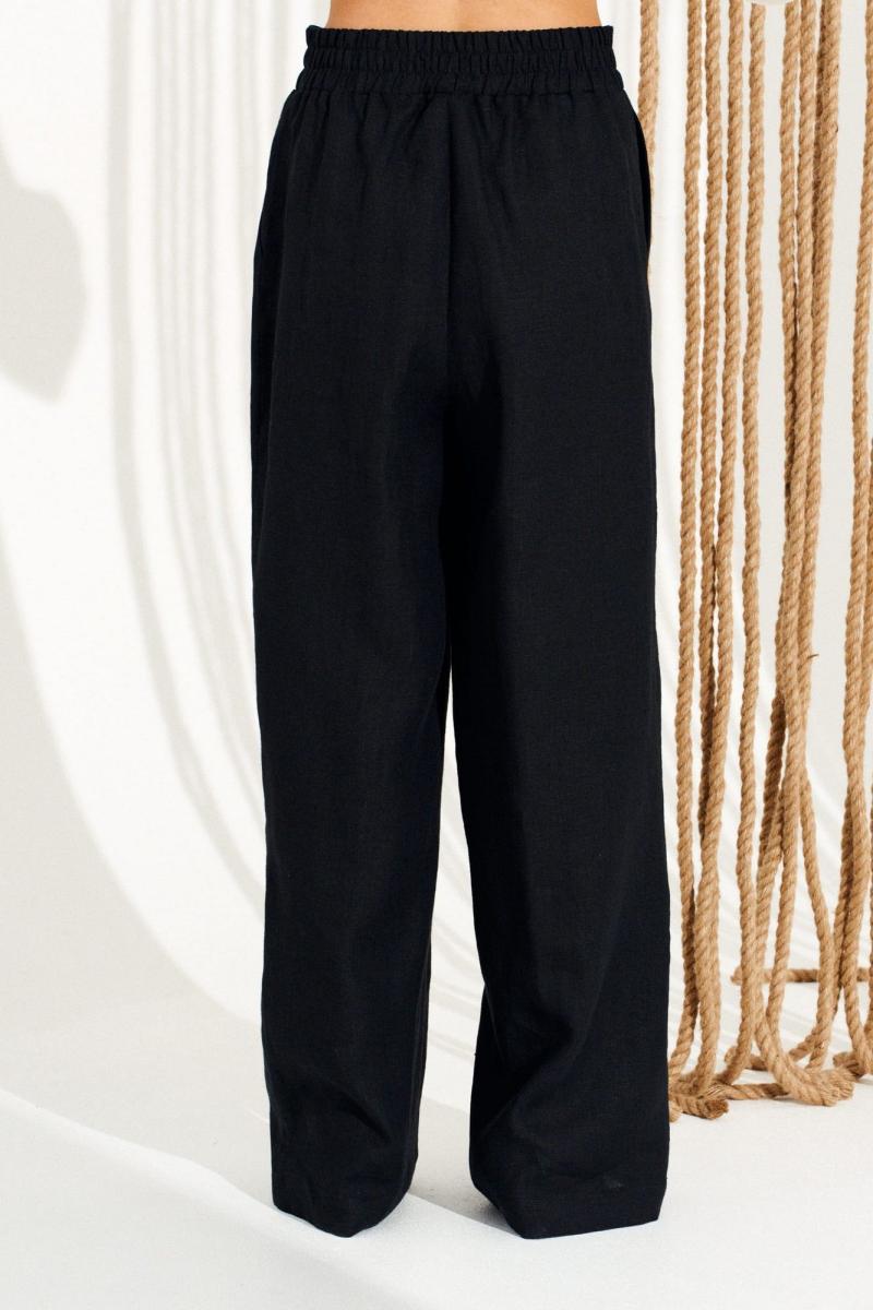 Брюки умеренного объема, прямого силуэта. На передних половинках выполнены боковые карманы с отрезным бочком. Пояс притачной, с резинкой по спинке и петлями по переду, в которые продета декоративная тесьма. Длина изделия на модели вдоль бокового шва с учетом пояса — 110,5 см (допустимое отклонение +/- 1 см)