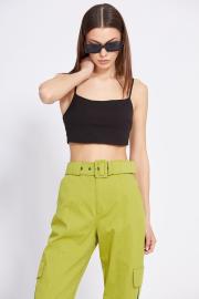 Брюки-карго выполнены из тонкого джинса. Брюки прямого покроя, на притачном поясе, в который частично вставлена эластичная тесьма по задней части. Спереди застежка на молнию с гульфиком и пуговицу. Карманы боковые с наклонным входом. Сзади накладные карманы, по боковым швам накладные карманы с клапанами. Низ брюк обработан манжетой с эластичной тесьмой. В комплект входит съемный ремень из основной ткани с обтяжной пряжкой.