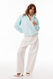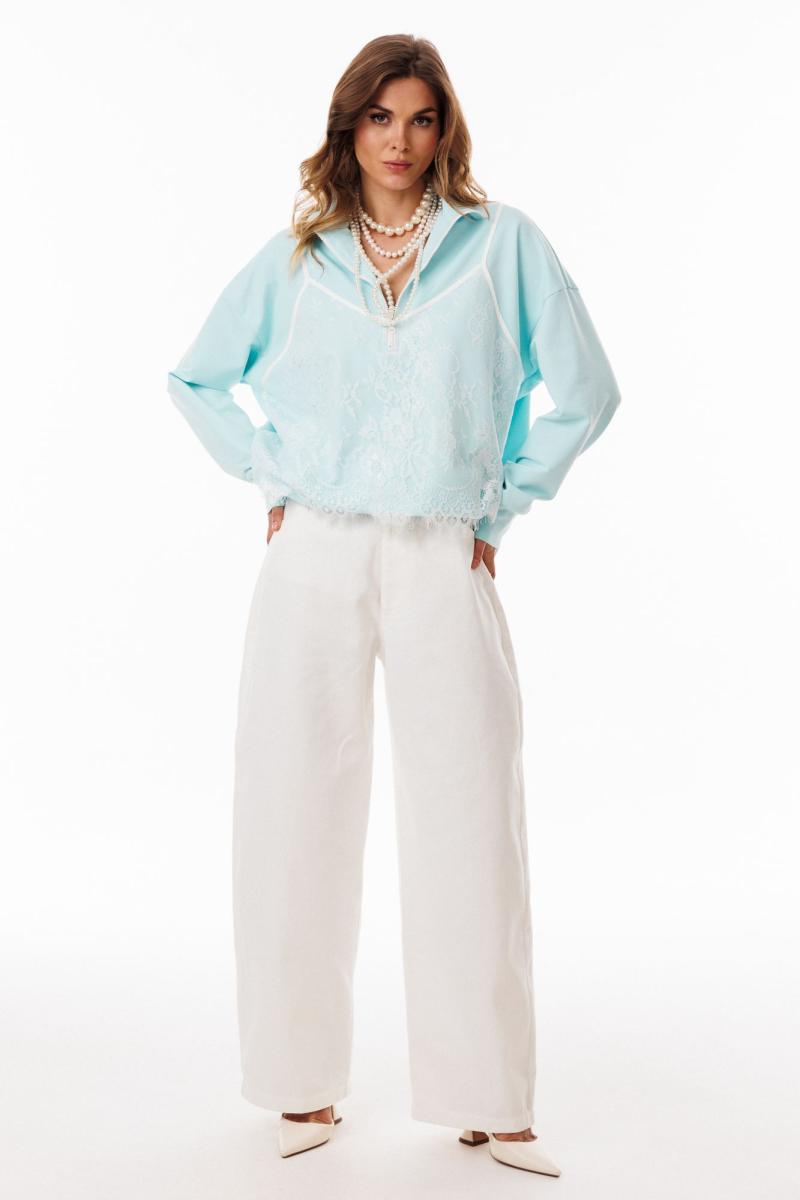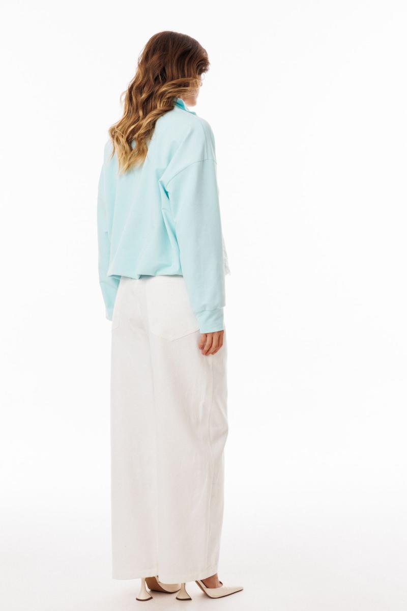 Брюки выполнены из джинса. Брюки прямого силуэта, на притачном поясе, длиной в пол. На передних частях обработаны фигурные боковые карманы и застёжка на металлическую молнию и пуговицу. На задних частях обработаны кокетки и накладные карманы. Пояс выполнен с декоративным отворотом на лицо. По поясу обработаны пять шлевок и декоративная петля.