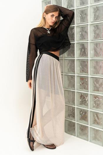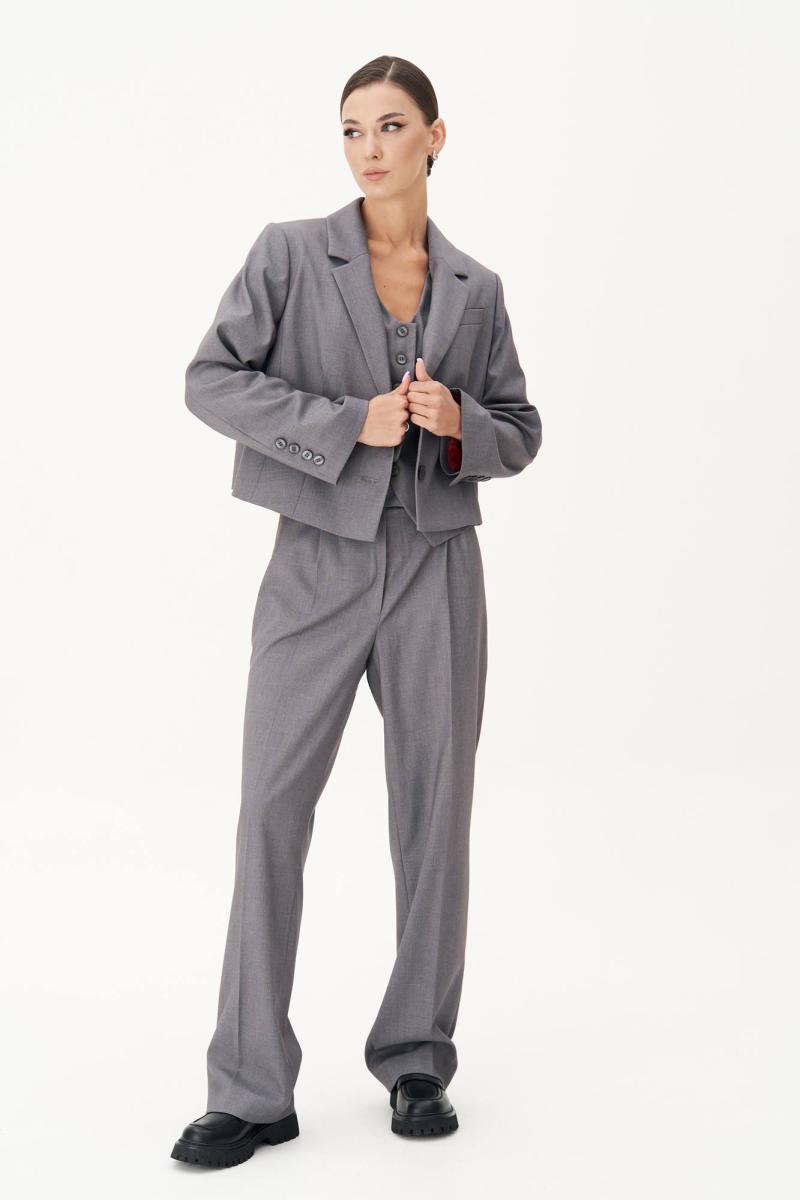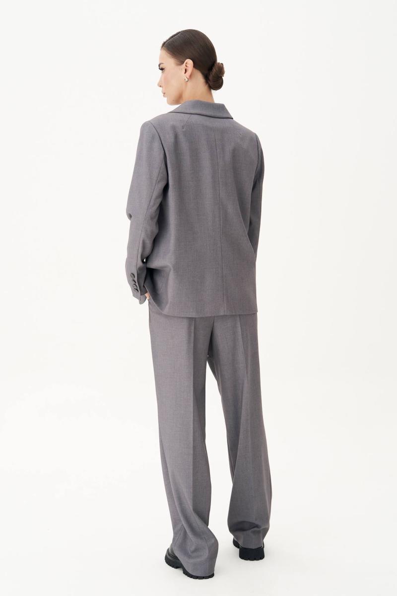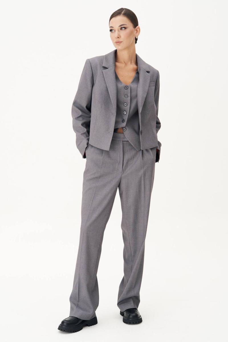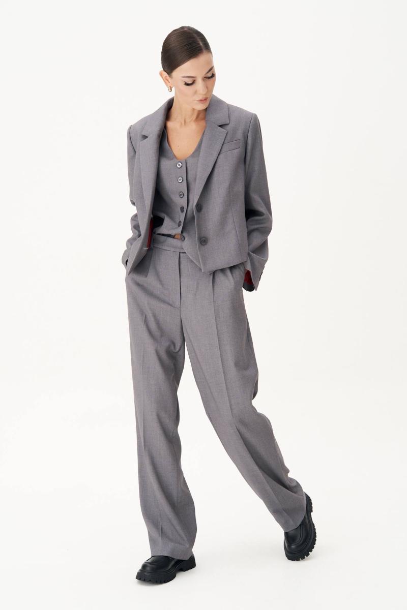 Брюки классического кроя с высокой посадкой на притачном поясе со шлёвками. Застежка брючная на потайной крючок и молнию. Передние половинки брюк с мягкой складкой-защипом и наклонными боковыми карманами. Задние половинки брюк с талиевыми вытачками и прорезными карманами с листочками. Длина брюк около 105 см.