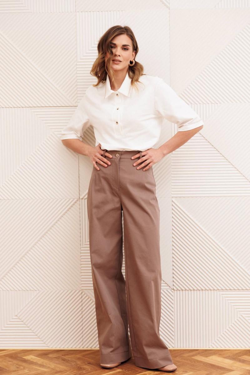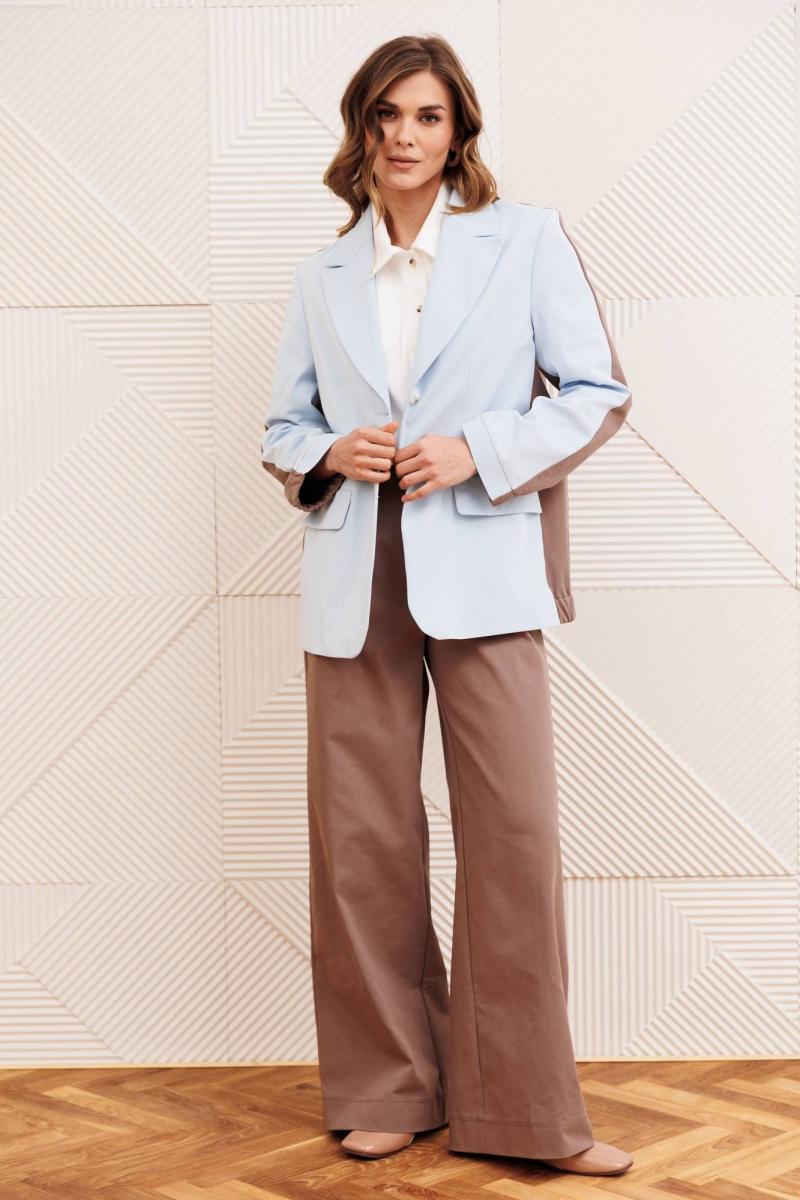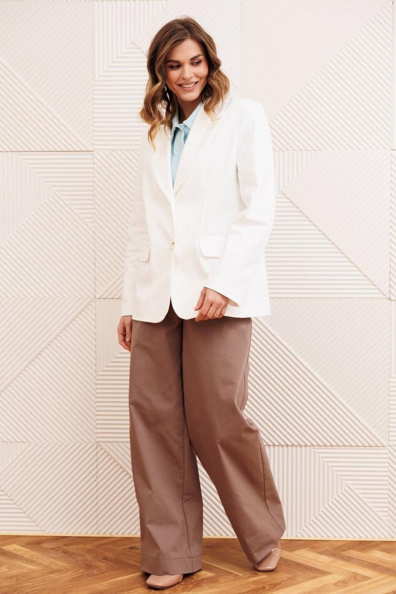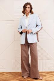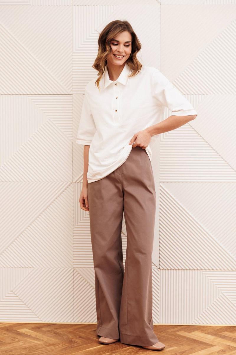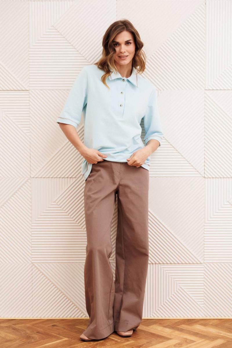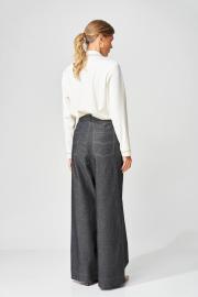 Брюки расширеные книзу на притачном поясе из джинсовой хлопковой ткани. По поясу настрочены шлевки. По передним и задним частям брюк вытачки. На задних частях брюк настрочены карманы. Карманы, вытачки, пояс, низ брюк отделаны отделочной строчкой. Длина брюк с учетом пояса - 109 см