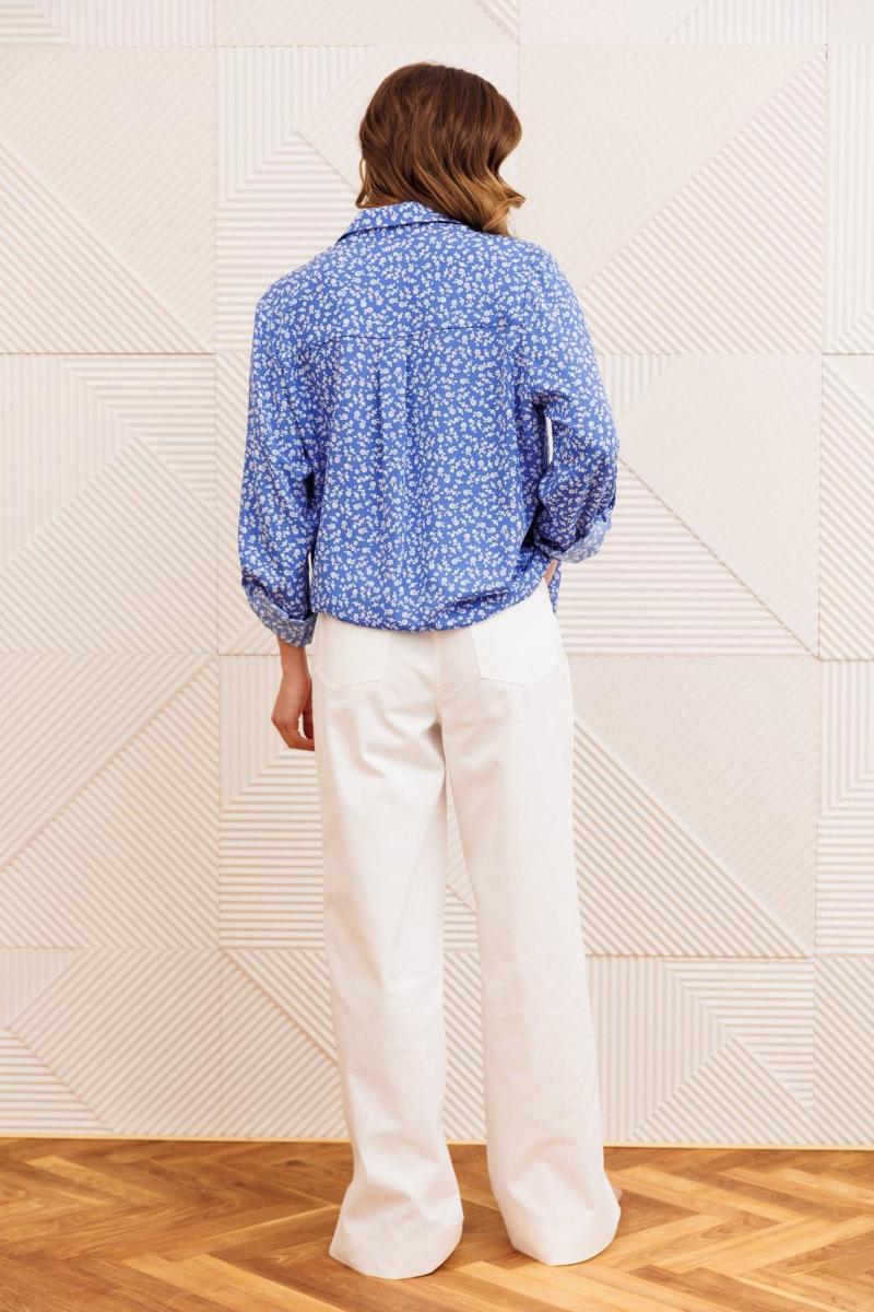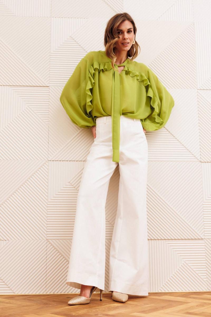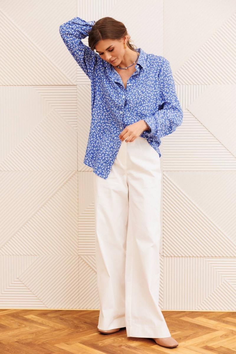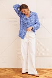 Брюки расширеные книзу на притачном поясе из джинсовой хлопковой ткани. По поясу настрочены шлевки. По передним и задним частям брюк вытачки. На задних частях брюк настрочены карманы. Карманы, вытачки, пояс, низ брюк отделаны отделочной строчкой. Длина брюк с учетом пояса - 109 см