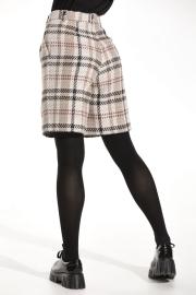 Описание внешнего вида: шорты с отрезным поясом, застежкой- гульфик. Пояс застегивается на одну петлю и пуговицу и крючок, на поясе расположены шлевки. На передних половинках – односторонние складки и карманы. Вход в карман наклонный к боковому шву. Силуэт: прямые. Цветовая гамма для верха, подкладки, фурнитуры, отделки: шорты из ткани с геометрическим рисунком. Все отделочные строчки в тон основной ткани.
