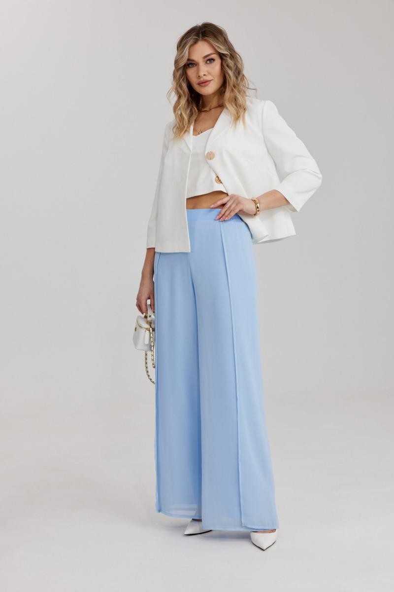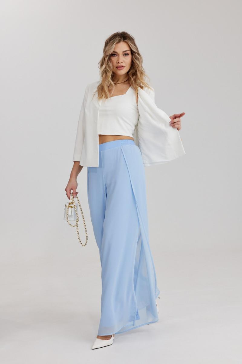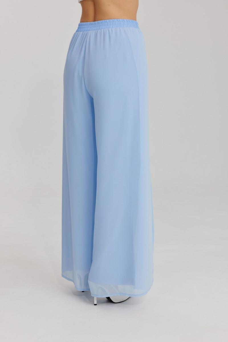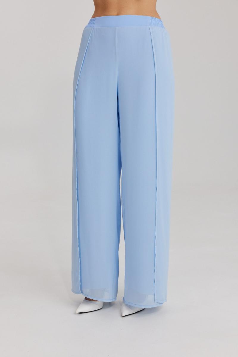 Брюки прямого силуэта, выполнены из шифоновой ткани на подкладке полной длинны. Боковой шов брюк открыт. Синка брюк заходит на перед по верхней части. Подкладка из не просвещающейся креповой ткани. Верх брюк обработан отрезным поясом. Центральная часть пояса без резинки, остальной пояс на резинке. Низ брюк обработан швом « в подгибку».