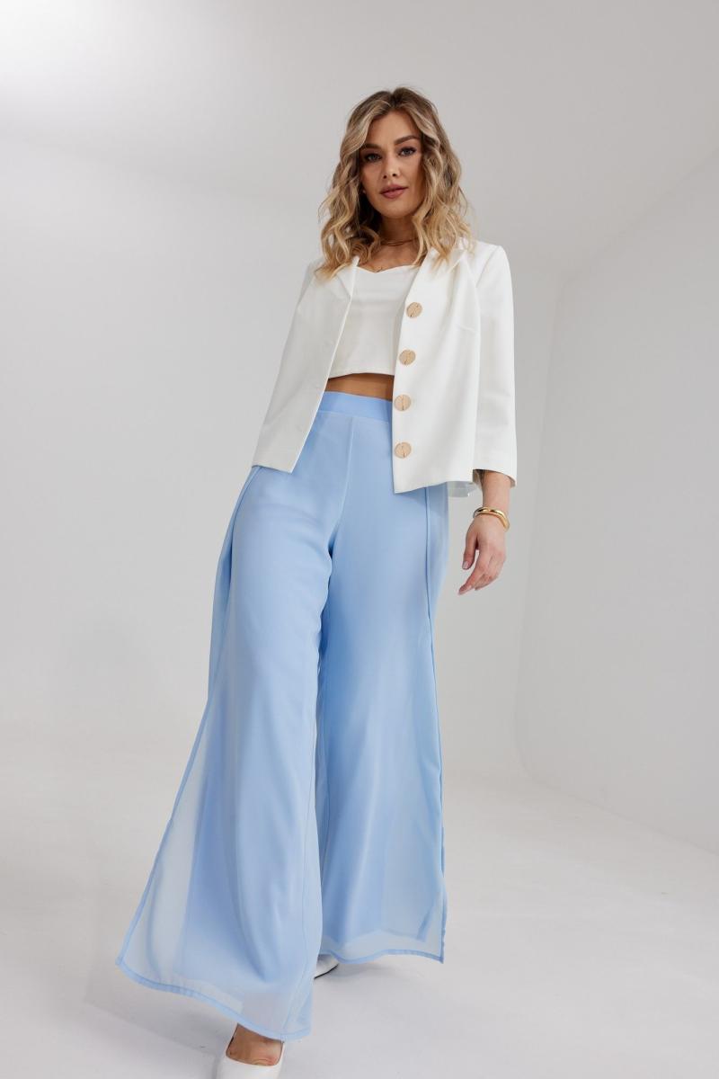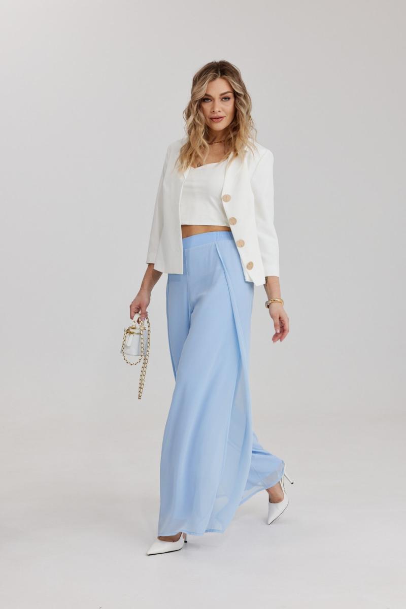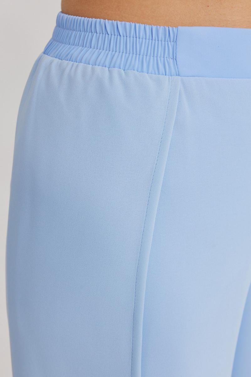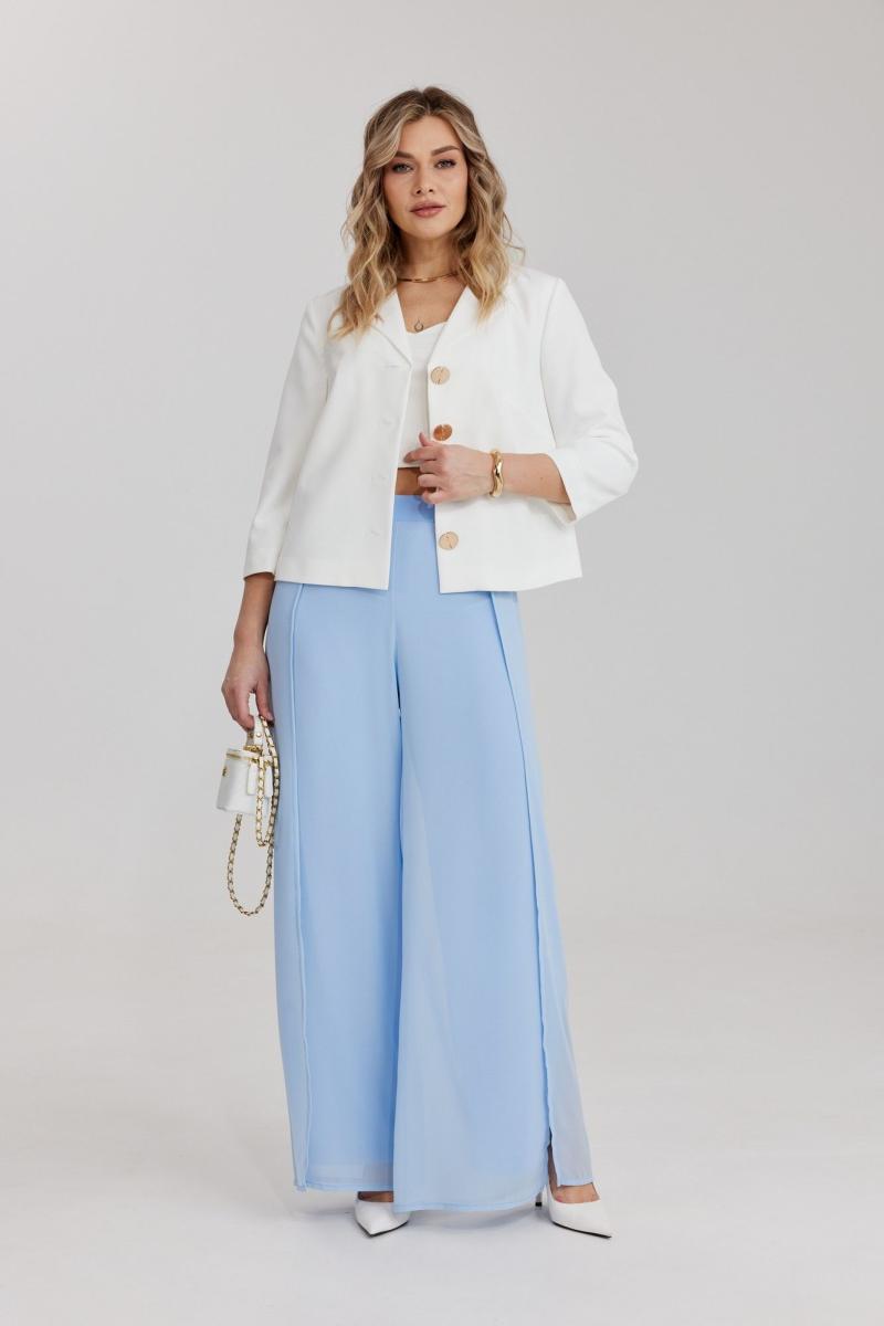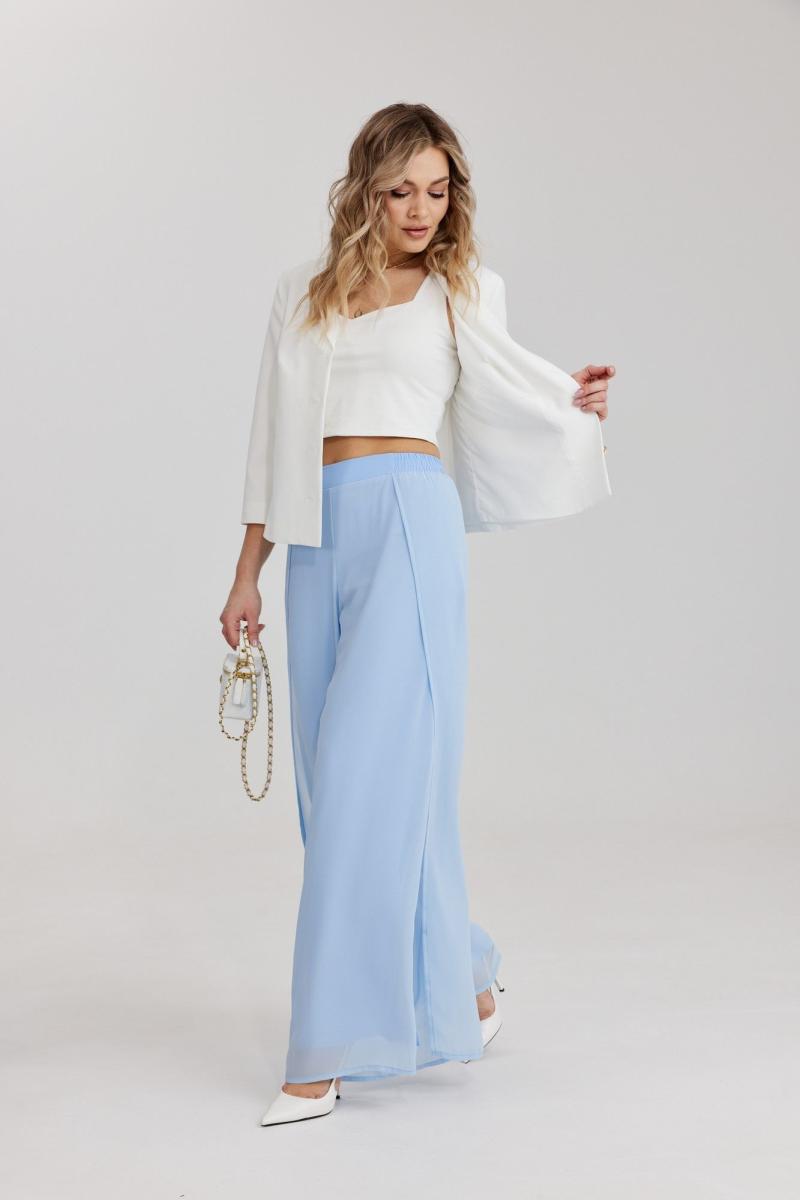 Брюки прямого силуэта, выполнены из шифоновой ткани на подкладке полной длинны. Боковой шов брюк открыт. Синка брюк заходит на перед по верхней части. Подкладка из не просвещающейся креповой ткани. Верх брюк обработан отрезным поясом. Центральная часть пояса без резинки, остальной пояс на резинке. Низ брюк обработан швом « в подгибку».