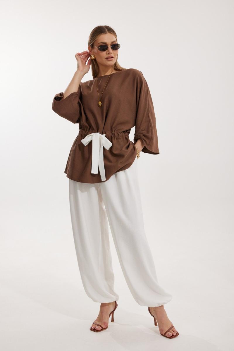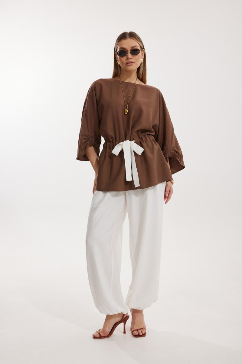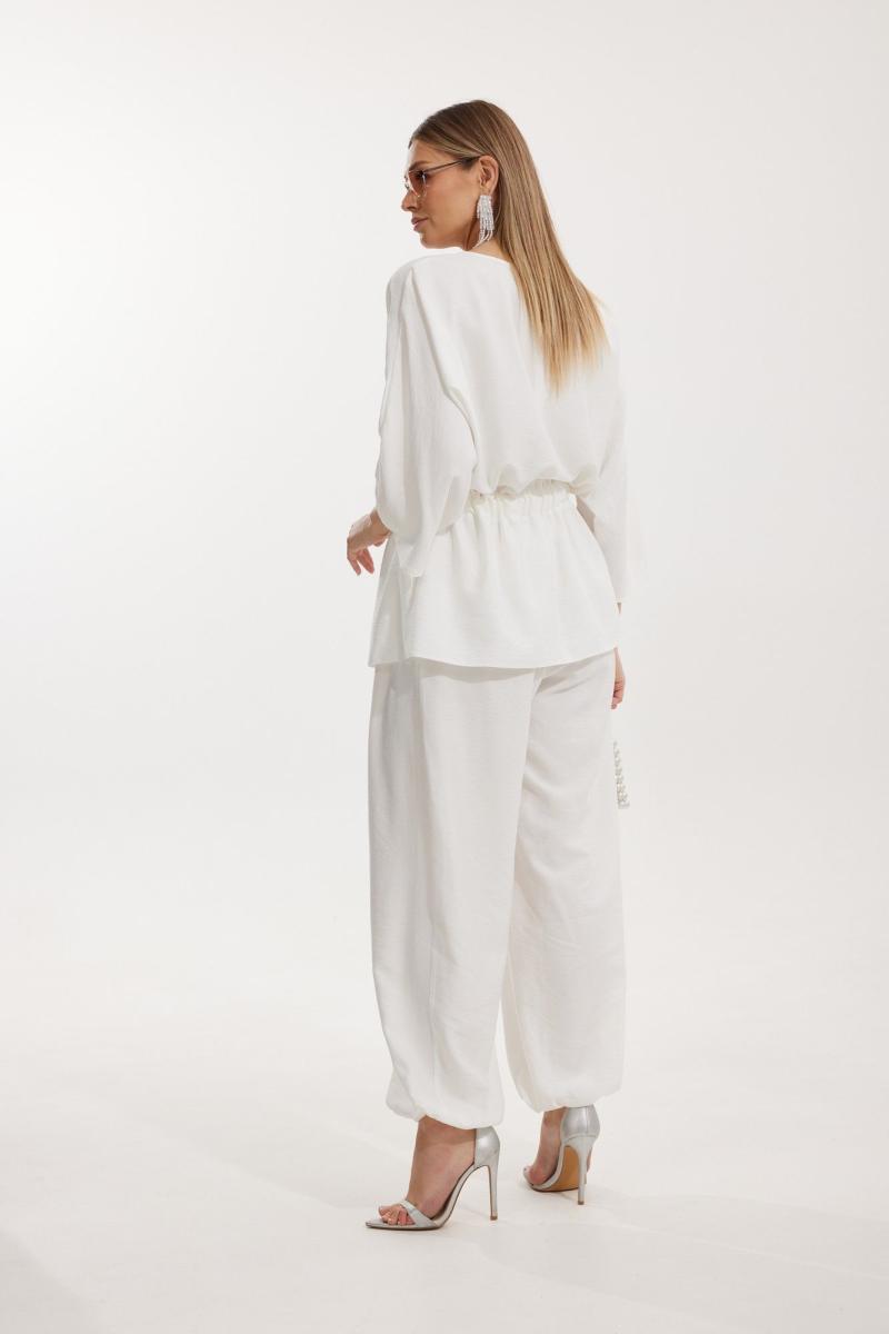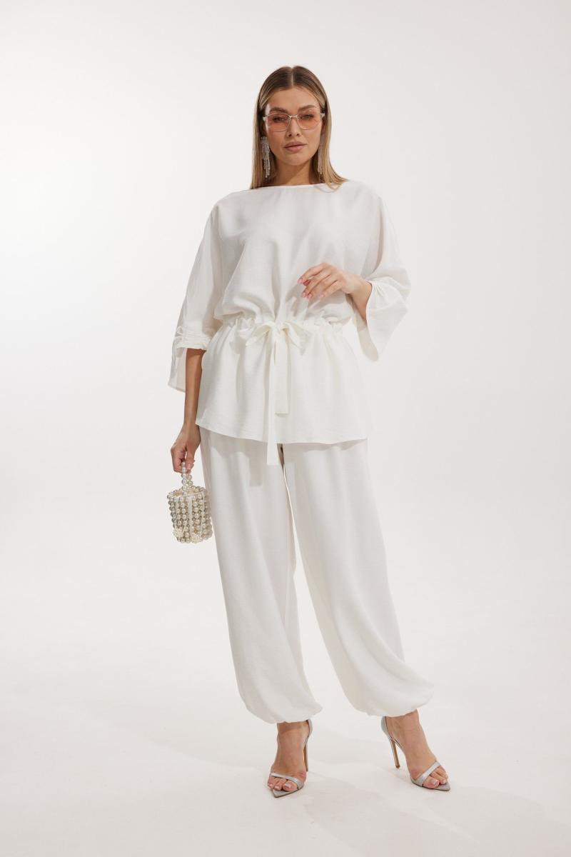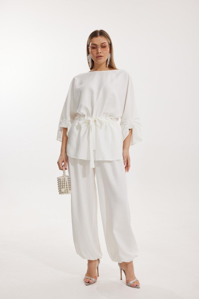 Брюки прямого силуэта с карманами в боковом шве и имитацией гульфика. Пояс притачной на резинке со шнуром в цвет отделочного канта. На задних половинках брюк застрочены вытачки. По низу брюки собраны на резинку.