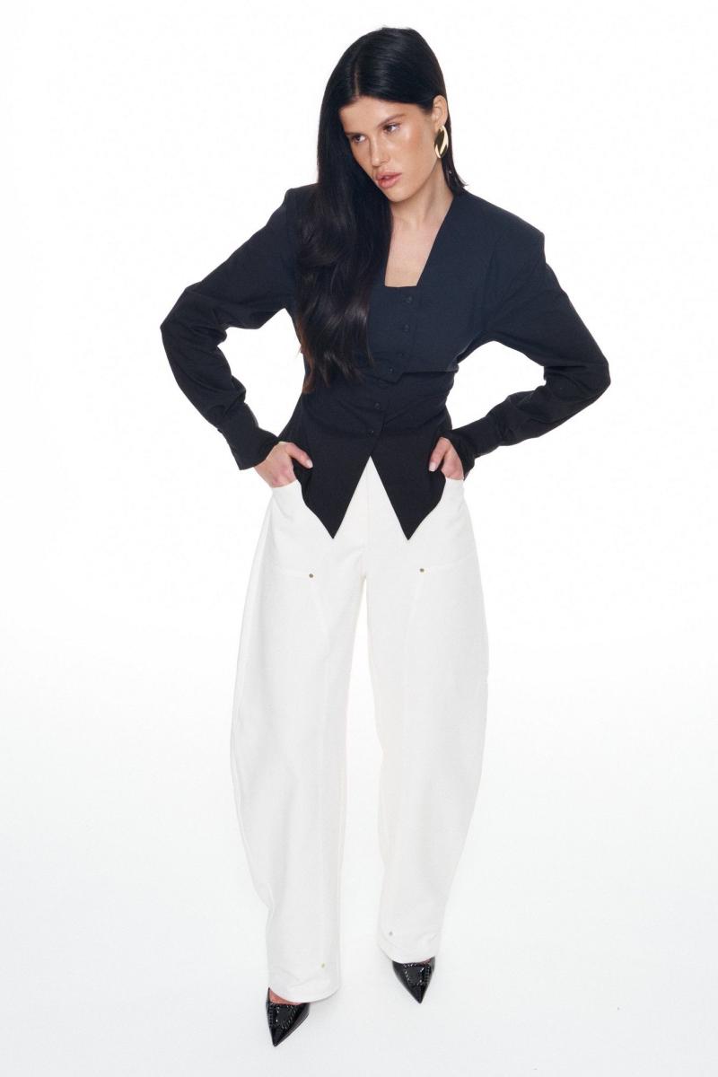 Брюки из плотного денима с выраженным объемом в области бедер и колен, сужающиеся книзу. Имеют сложные конструктивные членения с вертикальными рельефами, переходящими в коленные швы, что подчеркивает объемную форму. Спереди имеются классические карманы, сзади - накладные, прямоугольной формы. Притачной пояс со шлевками для ремня. Застежка на гульфик с молнией и пробивную металлическую пуговицу. По всем конструктивным швам (рельефам, входу в карманы, поясу, гульфику) проложены декоративные отделочные строчки.