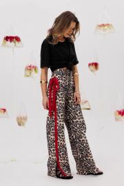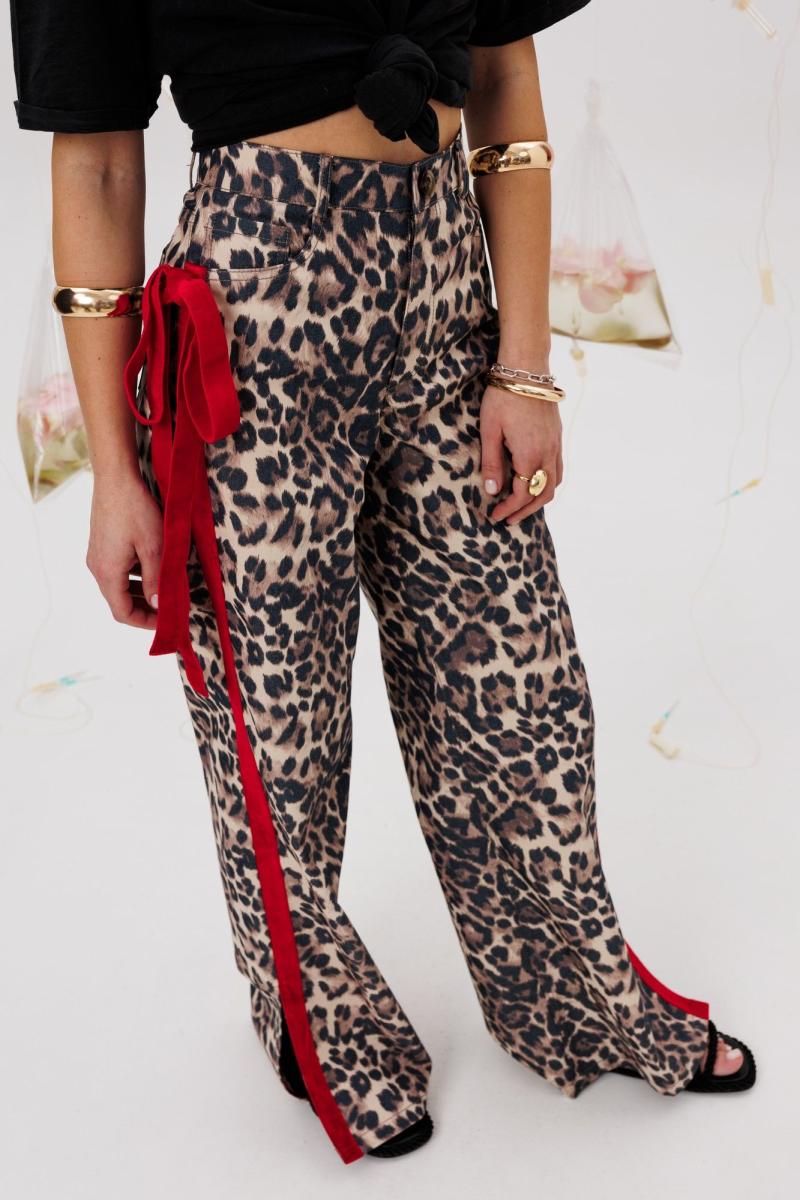 Джинсы с высокой посадкой. По боковым швам настрчена красная бархатная лента + сьемный бант на булавке. Крой брючин - расширенный к низу, с небольшими разрезами. Длина -113 см