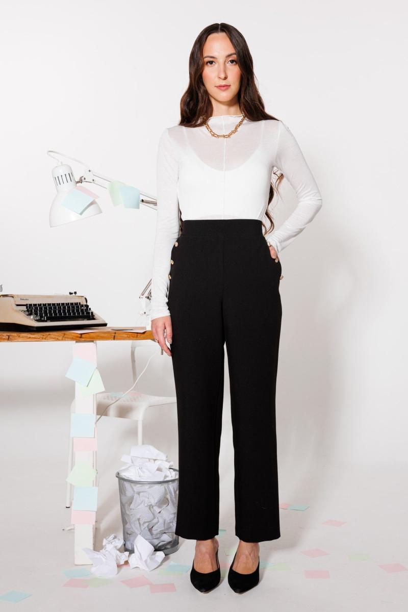 Прямые брюки на резинке - это сдержанность и лаконичность. Золотые дизайнерские пуговицы вдоль линии карманов, пояс сзади на резинке, это красота и удобство в одном флаконе. Это лучшие брюки для любого гардероба. Длина изделия – 100 см