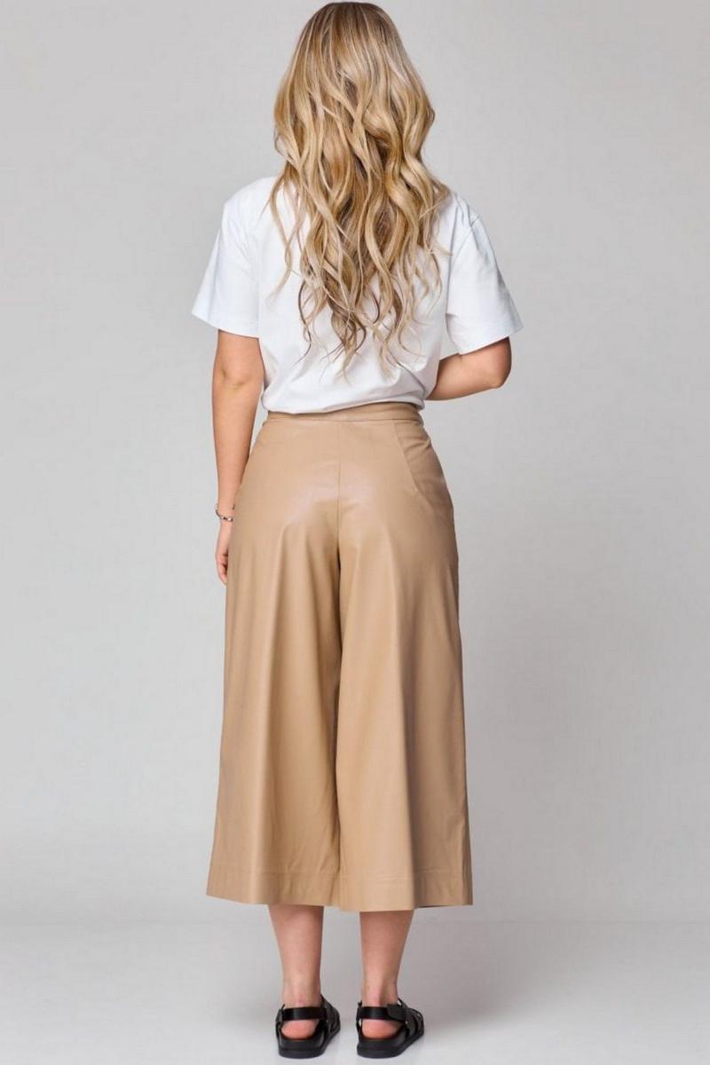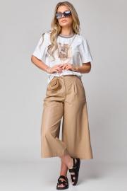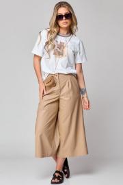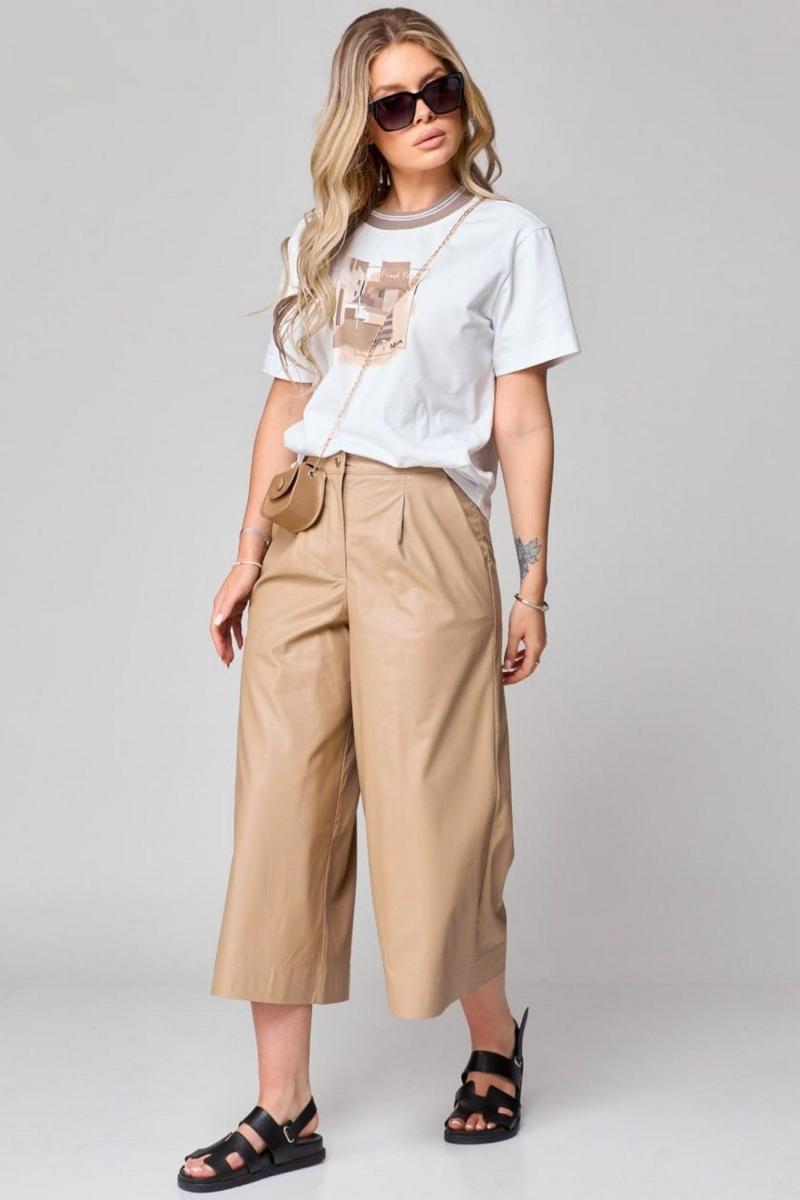 Кюлоты с высокой талией, расширенные к низу, с притачным поясом. Застежка на тесьму-молнию и 1 петлю и пуговицу-болт. На передних половинках обработаны по 1 складке-вытачке, в боковых швах наклонные карманы. На задних частях брюк обработаны по 1 вытачке на каждой половинке. Брюки: длина по боковому шву – 80см.