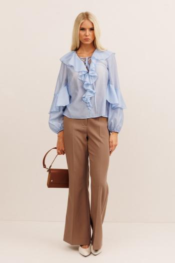 Брюки(джинсы) современного кроя из хлопка,высокой посадки на поясе с застёжкой на тесьму-молнию и джинсовую пуговицу.Накладные карманы сзади для удобства.