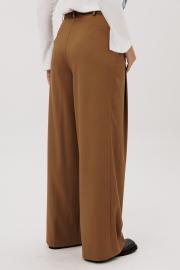 Брюки женские свободного силуэта с высокой посадкой, максимальным расширением от бедра (палаццо). Брюки на притачном поясе. По переду складки в центрах половинок брюк и застёжка на молнию с гульфиком и откоском. Талевые вытачки по задним половинкам брюк.