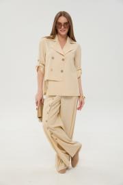 Брюки свободного кроя, верхний срез представлен широкой резинкой, с карманами. По центру правой брючины расположена планка с функционирующими петлями и пуговицами.