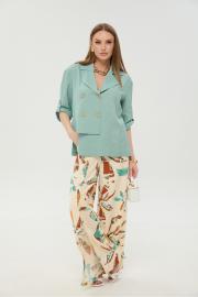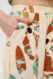 Брюки свободного кроя, верхний срез представлен широкой резинкой, с карманами. По центру правой брючины расположена планка с функционирующими петлями и пуговицами.