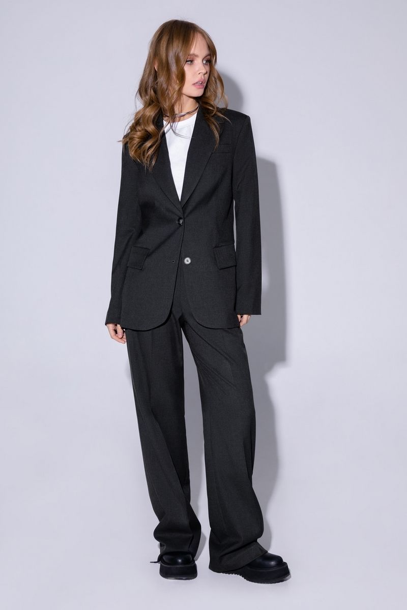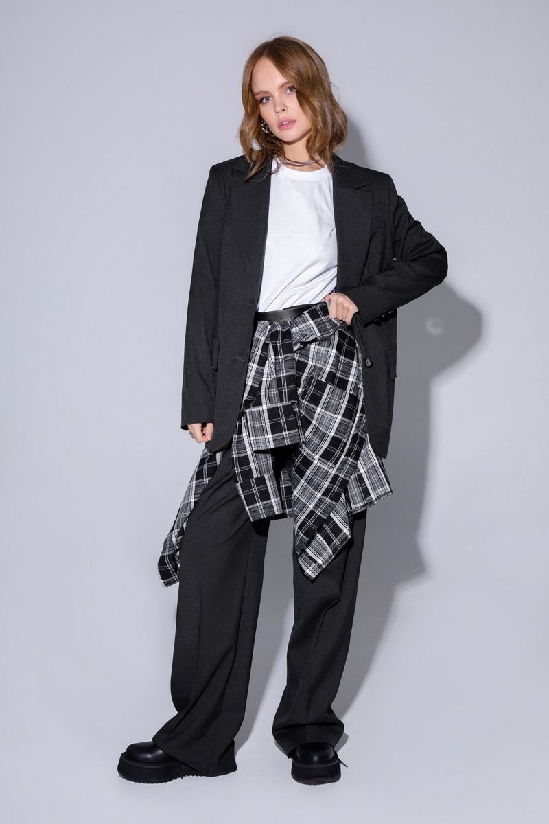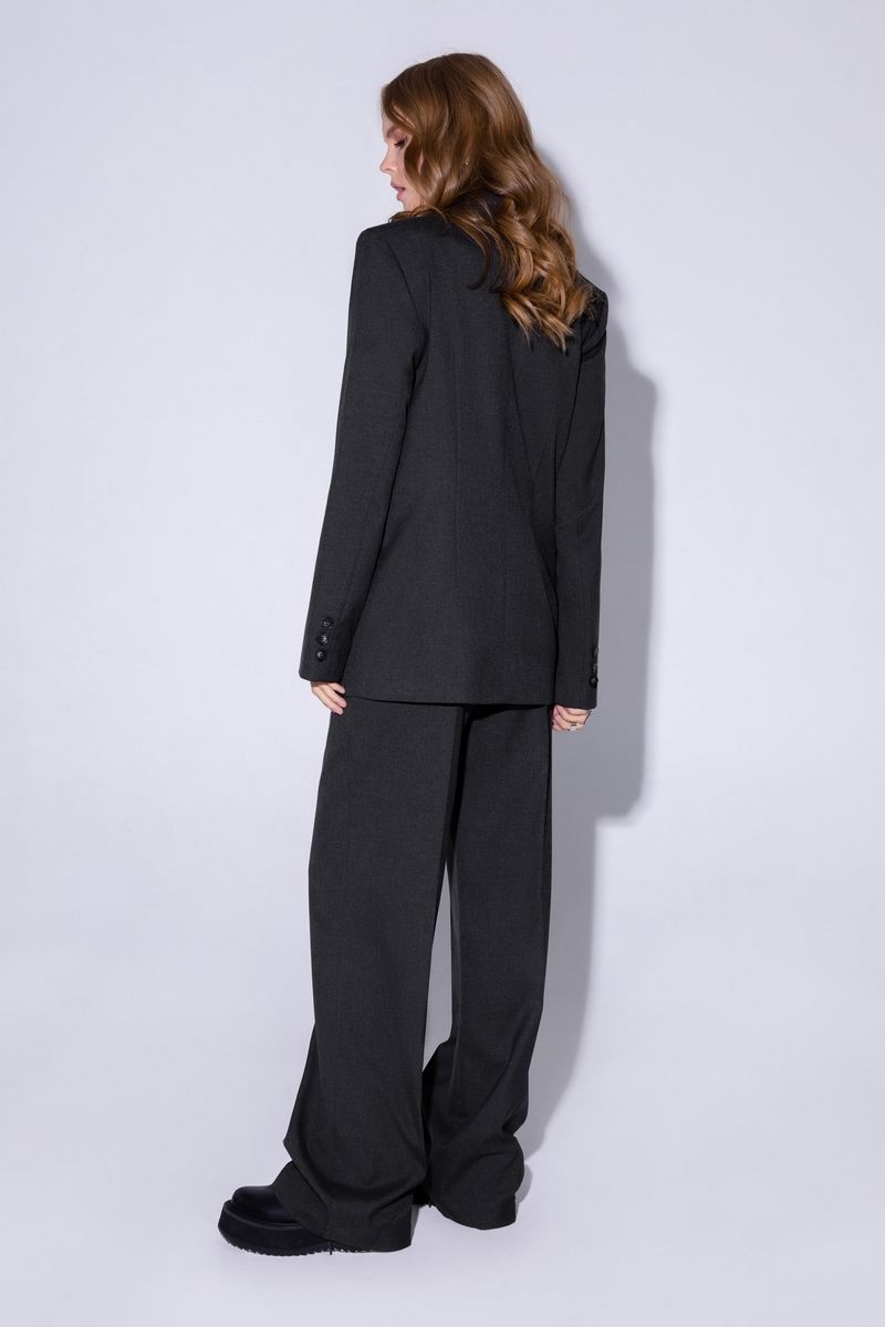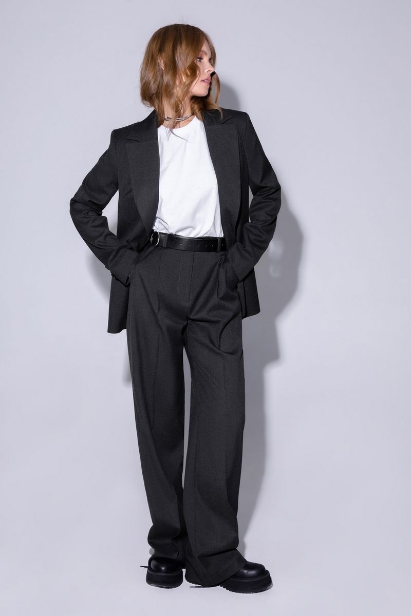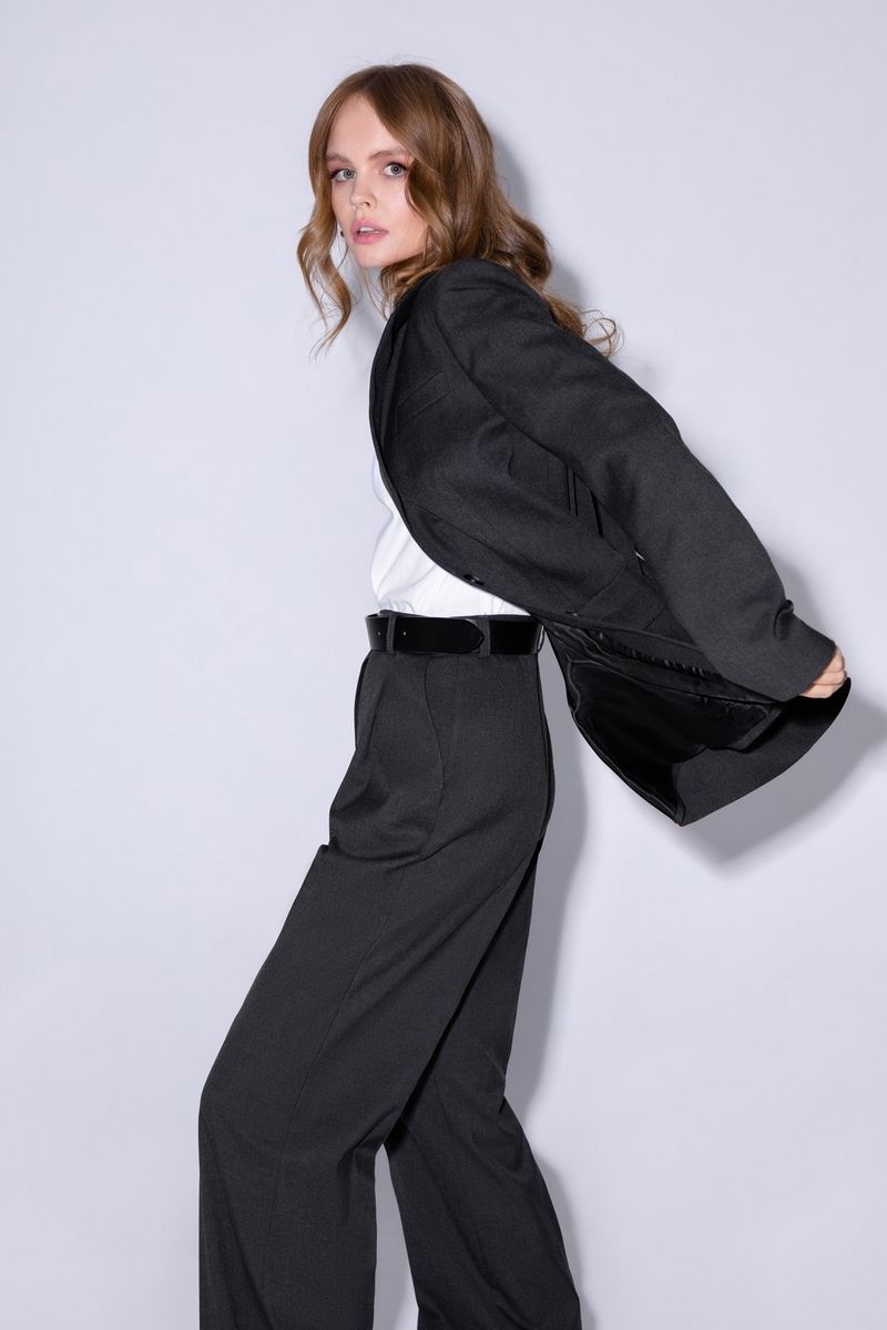 Текстильные прямые брюки-палаццо. Детали: брюки с высокой посадкой на притачном поясе со шлевками, застежка на молнию и пуговицу, боковые карманы, передние половины с заутюженными стрелками и двумя небольшими складками Длина брюк по боковому шву с поясом около 113/114,5 см