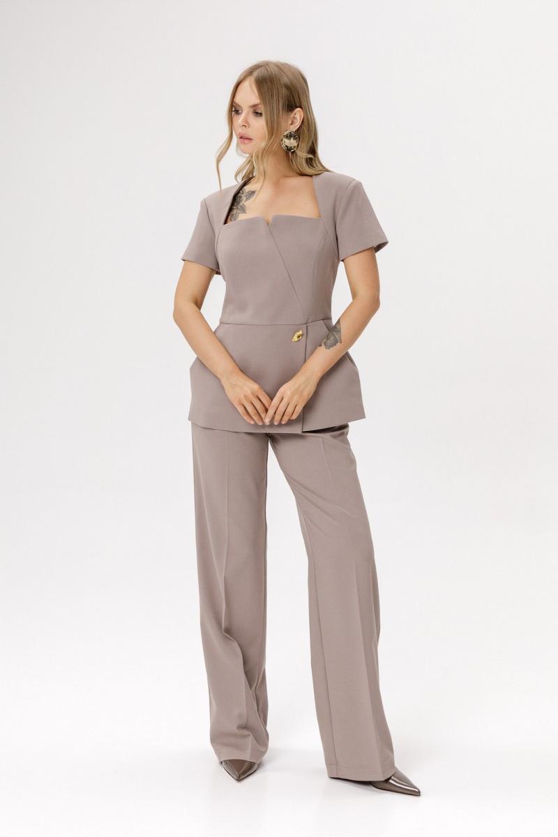 Прямые широкие брюки со стрелками. Детали: высокая посадка, притачной пояс со шлевками, передние половины с небольшими застроченными мягкими складками и заутюженными стрелками, застежка на молнию и пуговицу, боковые карманы. Задние части брюк с вытачками и заутюженными стрелками. Пояс брюк прямой, без резинки. Длина по боковому шву с поясом около 114 в размерах 40-46 и около 115,5 см в размерах 48-52. Длина по внутреннему шву около 83 см.