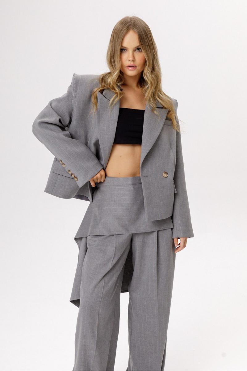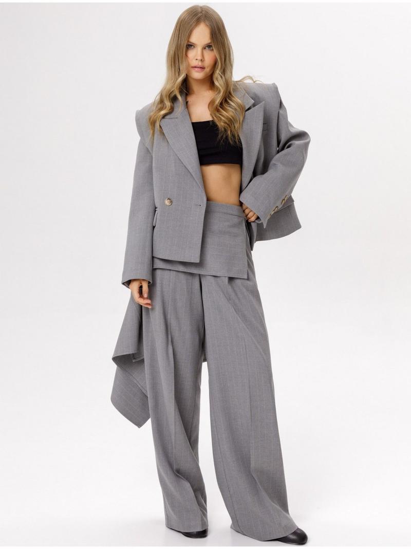 Широкие брюки-палаццо в полоску. Детали: брюки с притачным поясом со шлевками, складки у пояса, застежка на молнию и пуговицу, боковые карманы, заутюженные стрелки. Задние части брюк с вытачками и имитацией карманов. Длина по боковому шву с поясом около 109,5 см, длина по внутреннему шву около 83 см. Приобрести жакет с фото можно по арт. 6377, пояс-баску по арт.6379