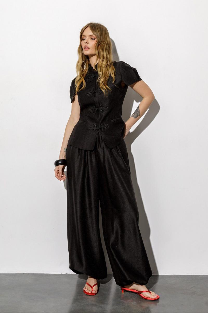 Широкие брюки-алладины (приобрести блузу с фото можно по арт.6583). Синий (приобрести жакет с фото можно по артикулу 6670 или блузу по арт. 6618, кейп по арт. 6640) Детали: брюки О-силуэта, притачной пояс, пояс и манжеты по низу на резинке, карманы в боковых швах. Длина по боковому шву с поясом около 110 см в размерах 40-52. Длина по внутреннему шву около 75 см