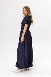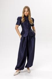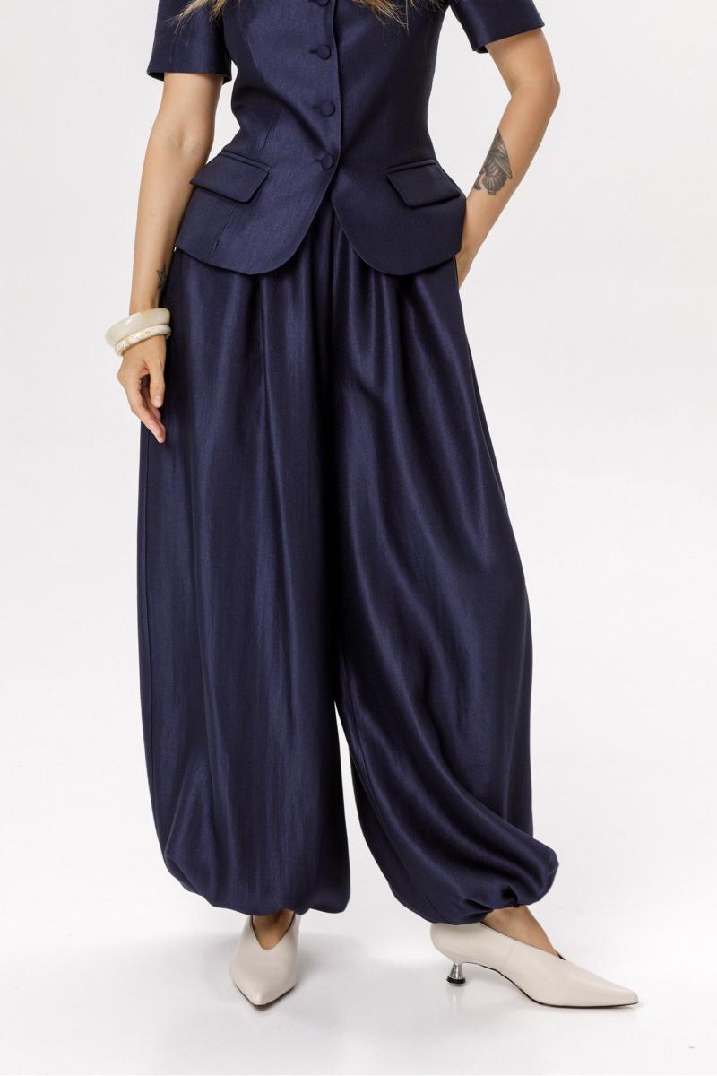 Широкие брюки-алладины. Детали: брюки О-силуэта, притачной пояс, пояс и манжеты по низу на резинке, карманы в боковых швах. Длина по боковому шву с поясом около 110 см в размерах 40-52. Длина по внутреннему шву около 75 см