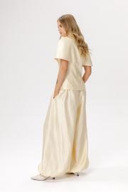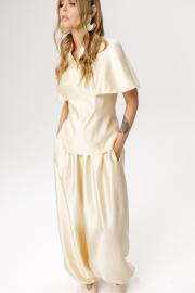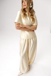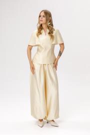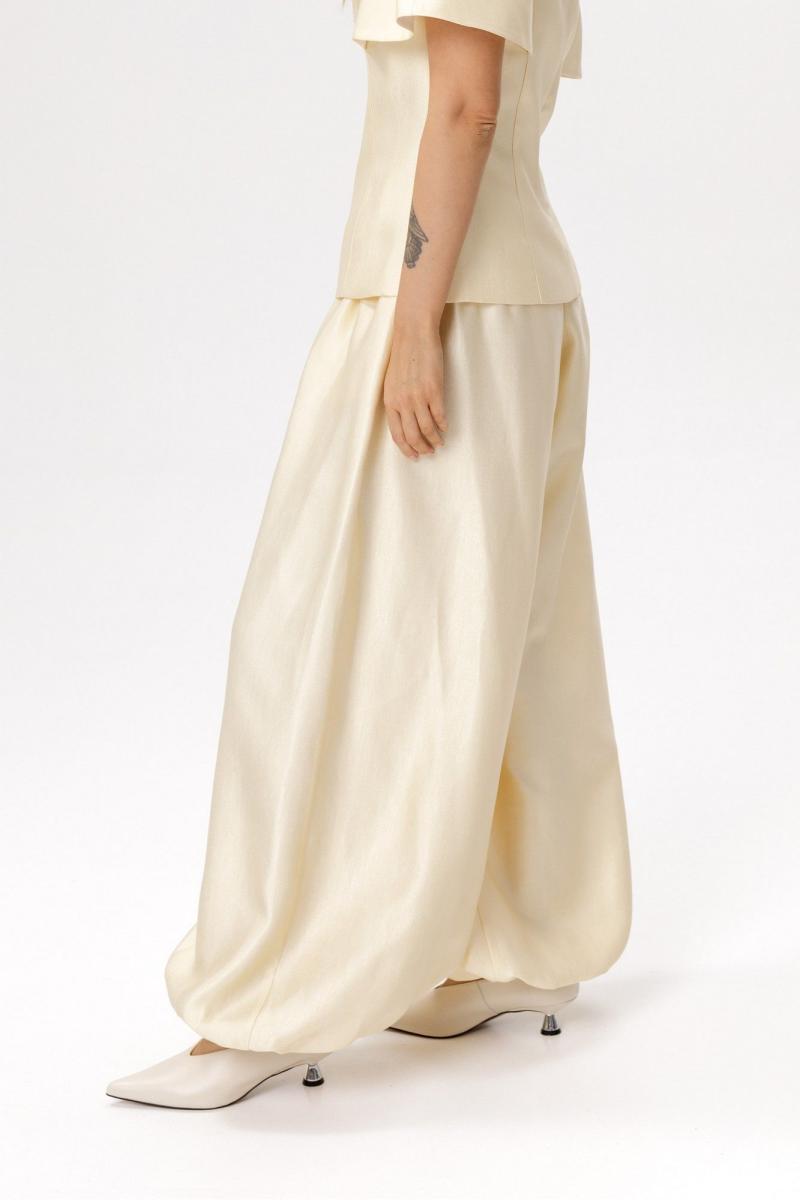Широкие брюки-алладины (приобрести блузу с фото можно по арт.6583). Детали: брюки О-силуэта, притачной пояс, пояс и манжеты по низу на резинке, карманы в боковых швах. Длина по боковому шву с поясом около 110 см в размерах 40-52. Длина по внутреннему шву около 75 см
