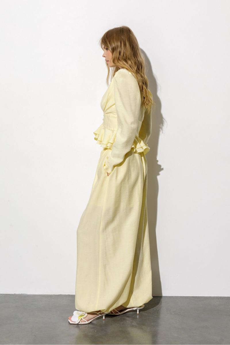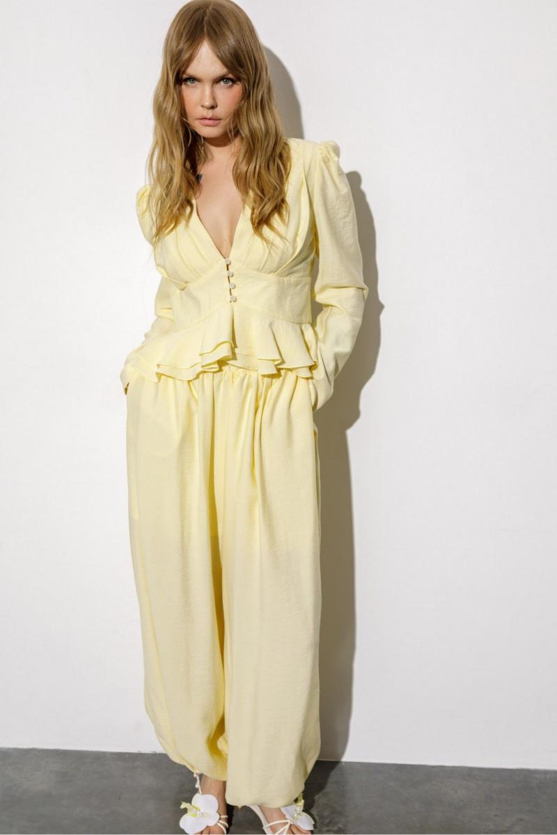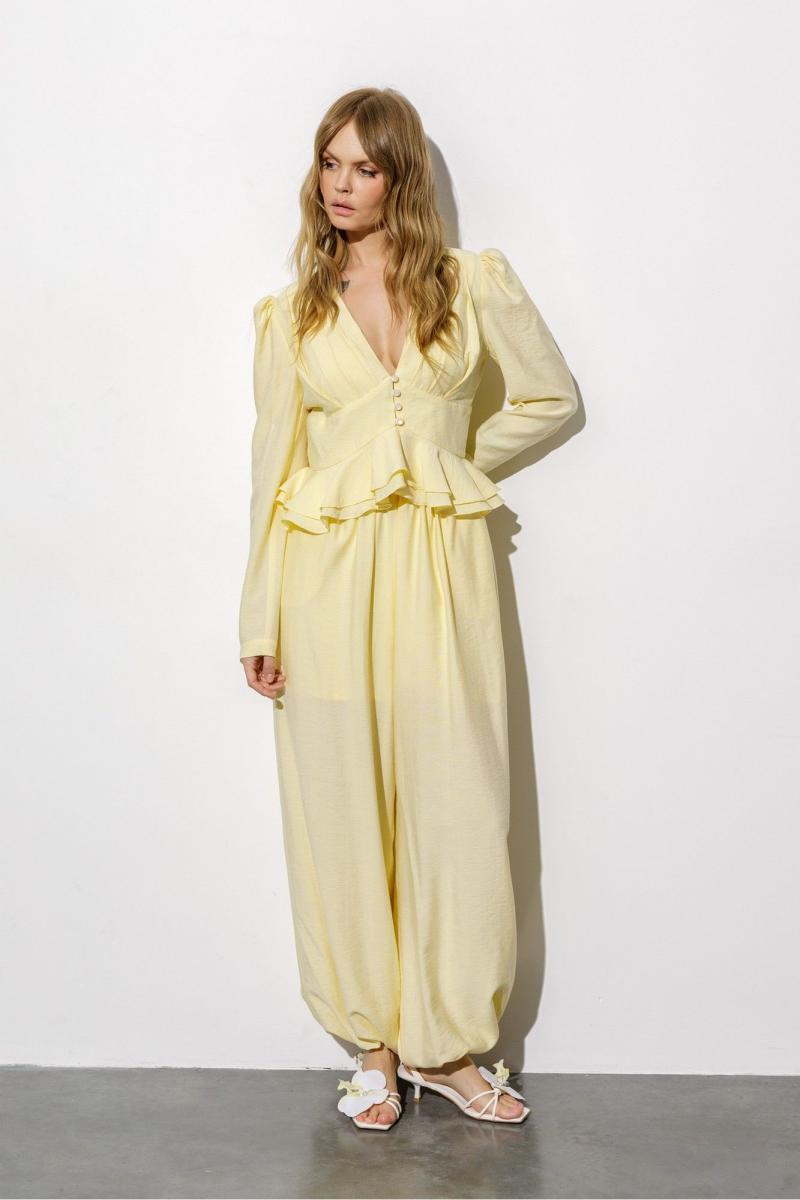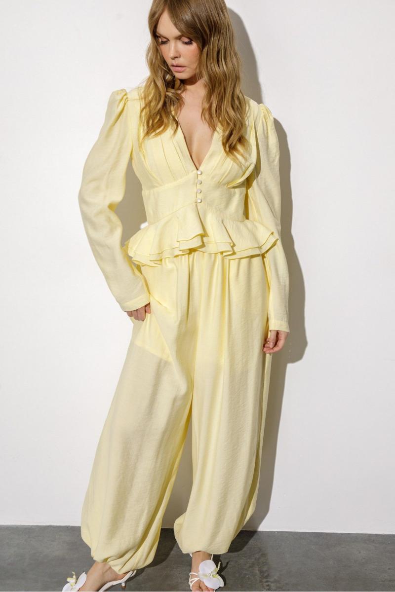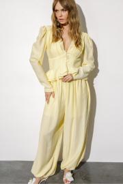Широкие свободные брюки-алладины из вискозы (приобрести блузу с фото можно по арт. 6720). Детали: брюки с высокой посадкой на притачном эластичном поясе, без застежки, боковые карманы, низ брюк с эластичными манжетами, брюки без подкладки. Длина по боковому шву с поясом около 108 см, длина по внутреннему шву около 75 см
