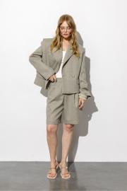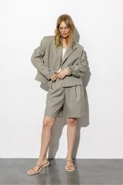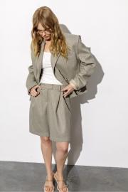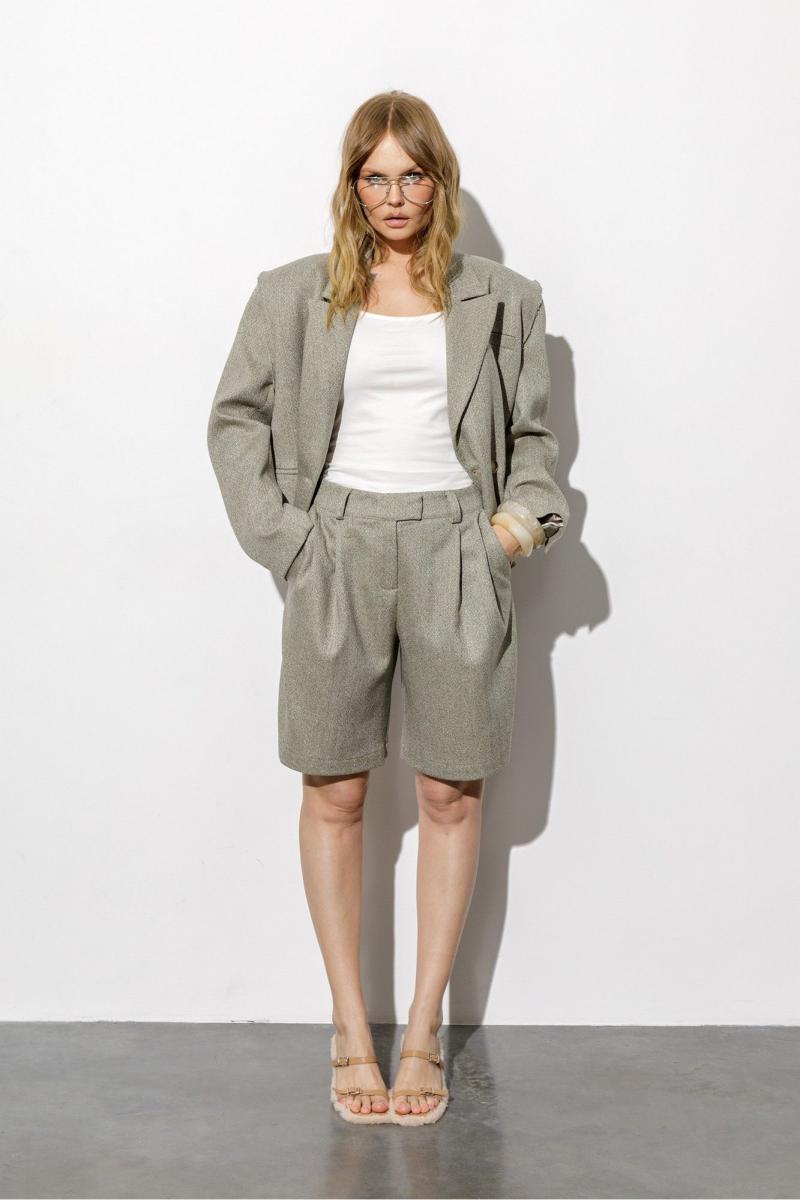 Шорты-бермуды с широкими складками из костюмной ткани «ёлочку» (приобрести жакет с фото можно по арт. 6723). Детали: средняя посадка, притачной пояс со шлевками, застежка на молнию и брючный крючок, боковые карманы. Задние части шорт с вытачками и имитацией карманов. Длина по боковому шву с поясом около 51 см в размерах 40-46 и около 54 см в размерах 48-52. Длина шорт по внутреннему шву около 23 см в размерах 40-46 и около 25 см в размерах 48-52