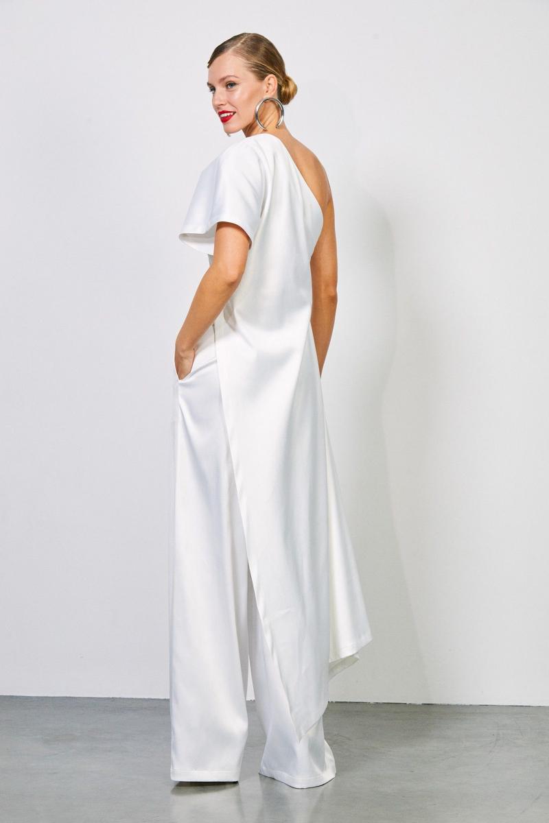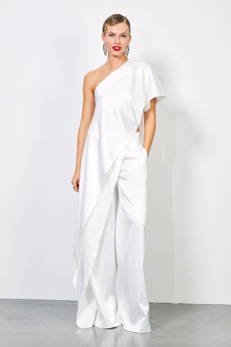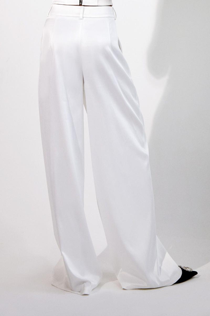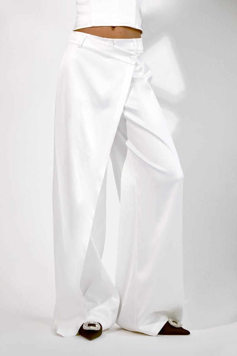 Брюки из атласа: - прямой силуэт - верх брюк на притачном поясе - по переду отлетная деталь, имитирующая запах - карманы в боковых швах.