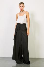 Брюки: - расширенный силуэт - справа отлетная деталь и декоративная пата, закреплённая в кольцах - шлёвки на притачном поясе - карманы в боковых швах - застёжка на молнию и пуговицу.