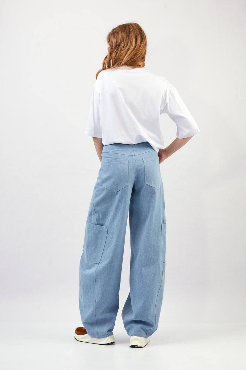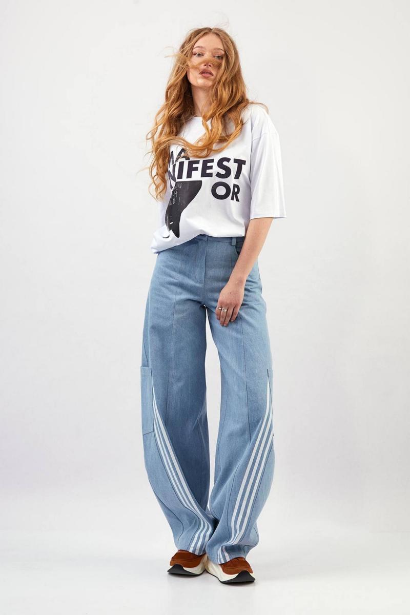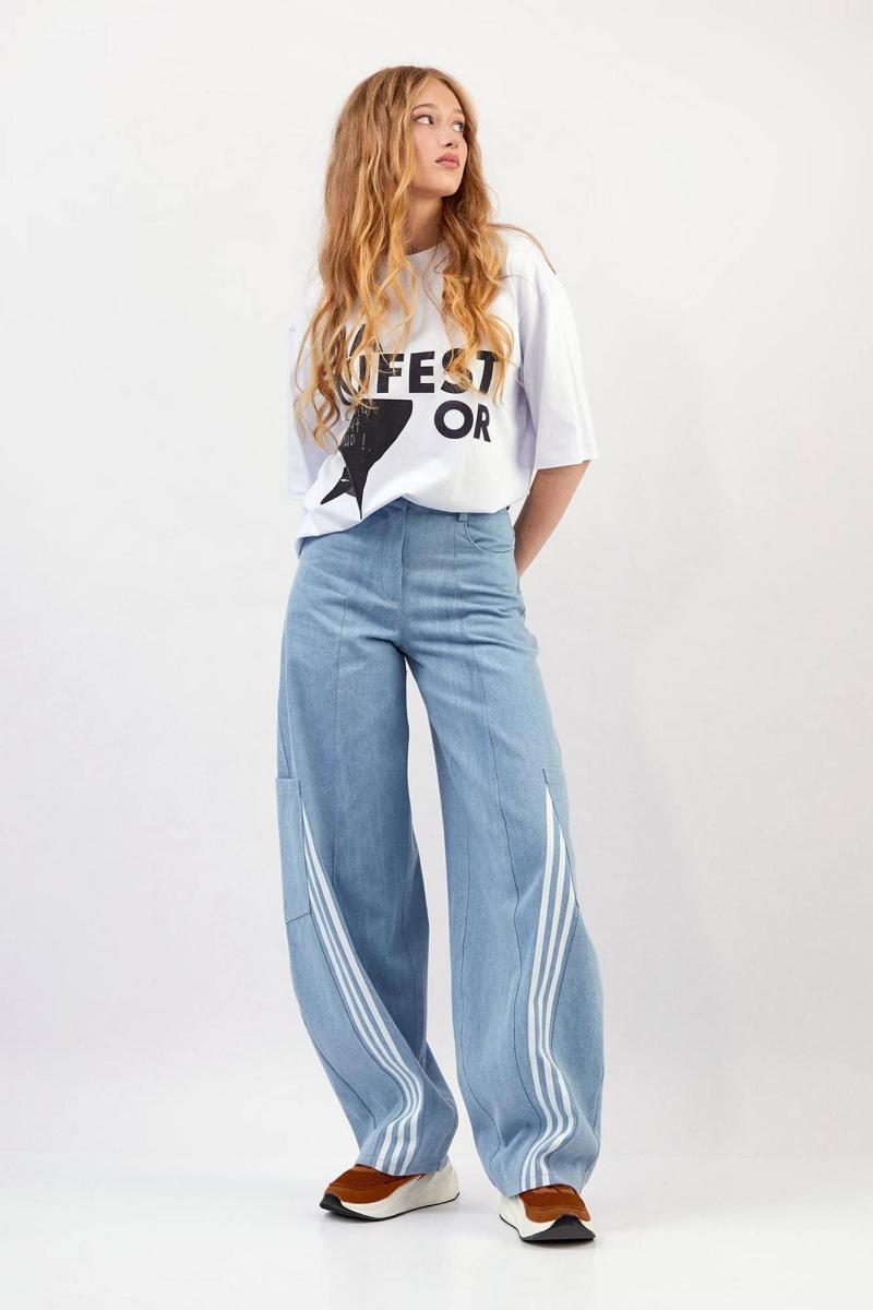 Брюки из плотного джинса - силуэт расширенный книзу, форма штанины ""банан"" - прямой пояс с пятью шлёвками и застёжкой на кнопку - декоративные членения спереди и сзади, отделаны одинарными и двойными строчками - спереди тройные лампасы - сзади кокетка и фигурные накладные карманы