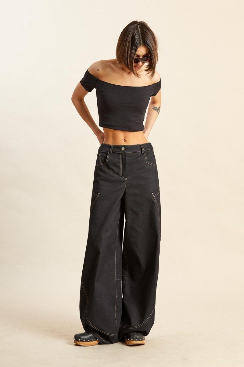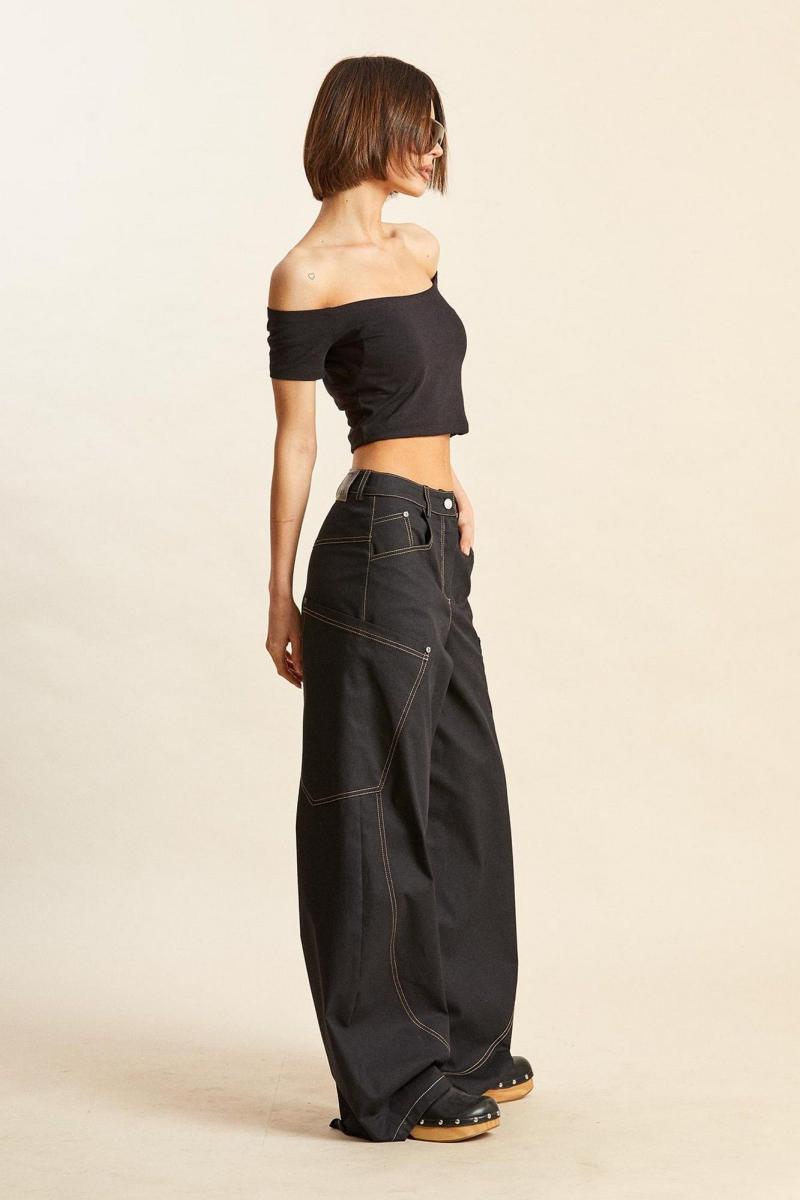 Брюки из тонкого джинса: - О- силуэт; - пояс притачной со шлёвками и застёжкой на кнопку; - спереди застёжка на молнию; - в боковых швах спереди карманы угольной формы; - спереди рельефные швы округлой формы; - сзади кокетка и большие накладные карманы, заходящие на перед; - на участке под коленями горизонтальные вытачки; - все отделочные швы с одинарной и двойной отстрочкой.