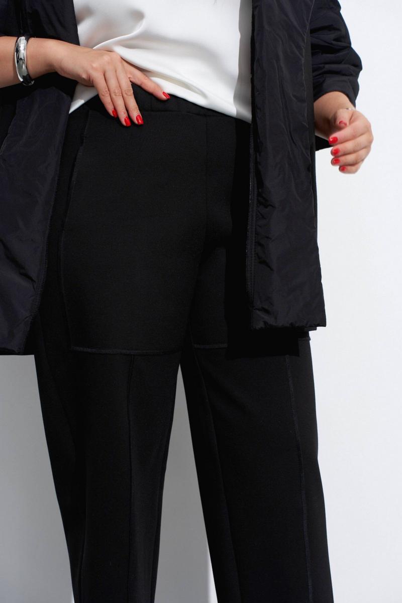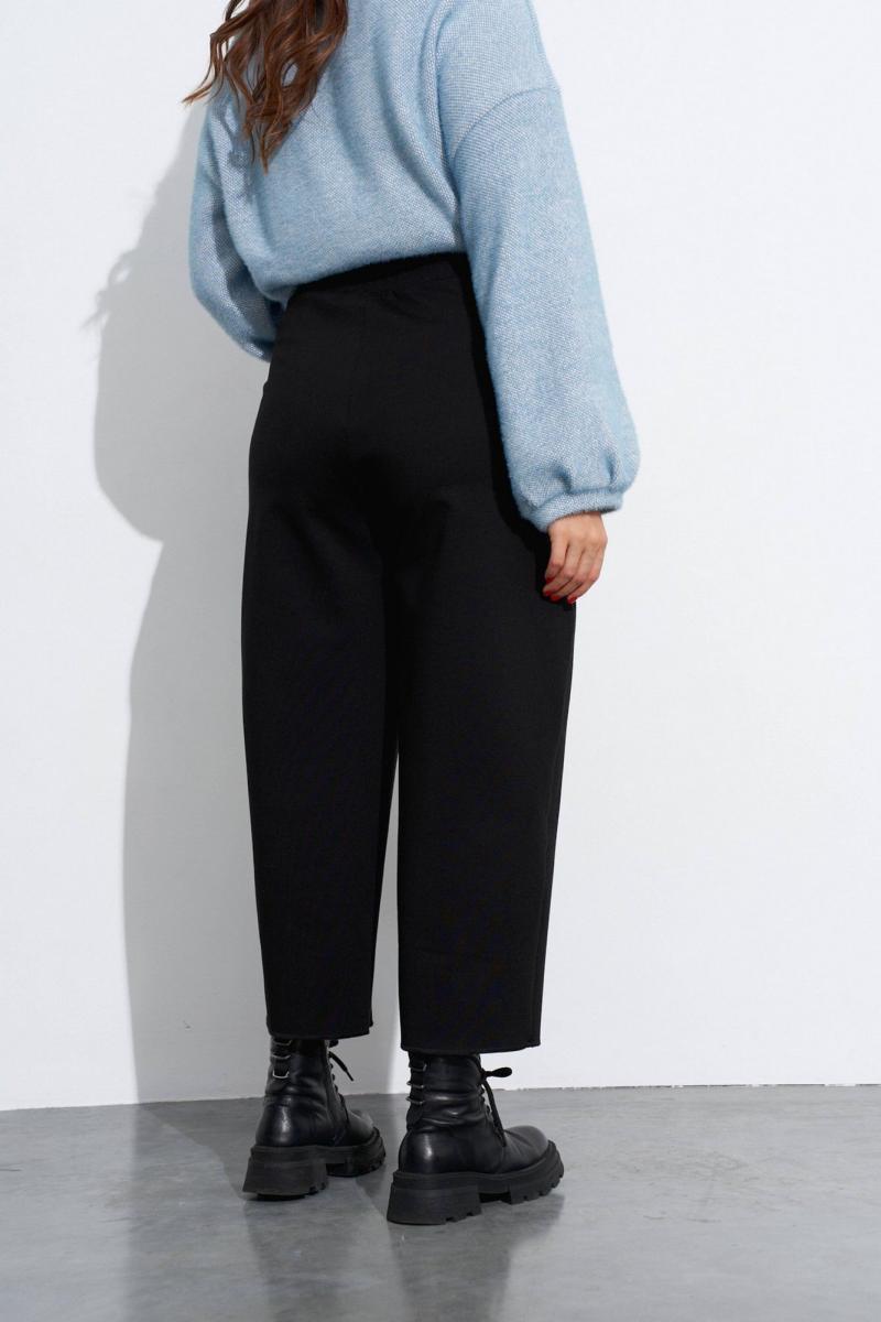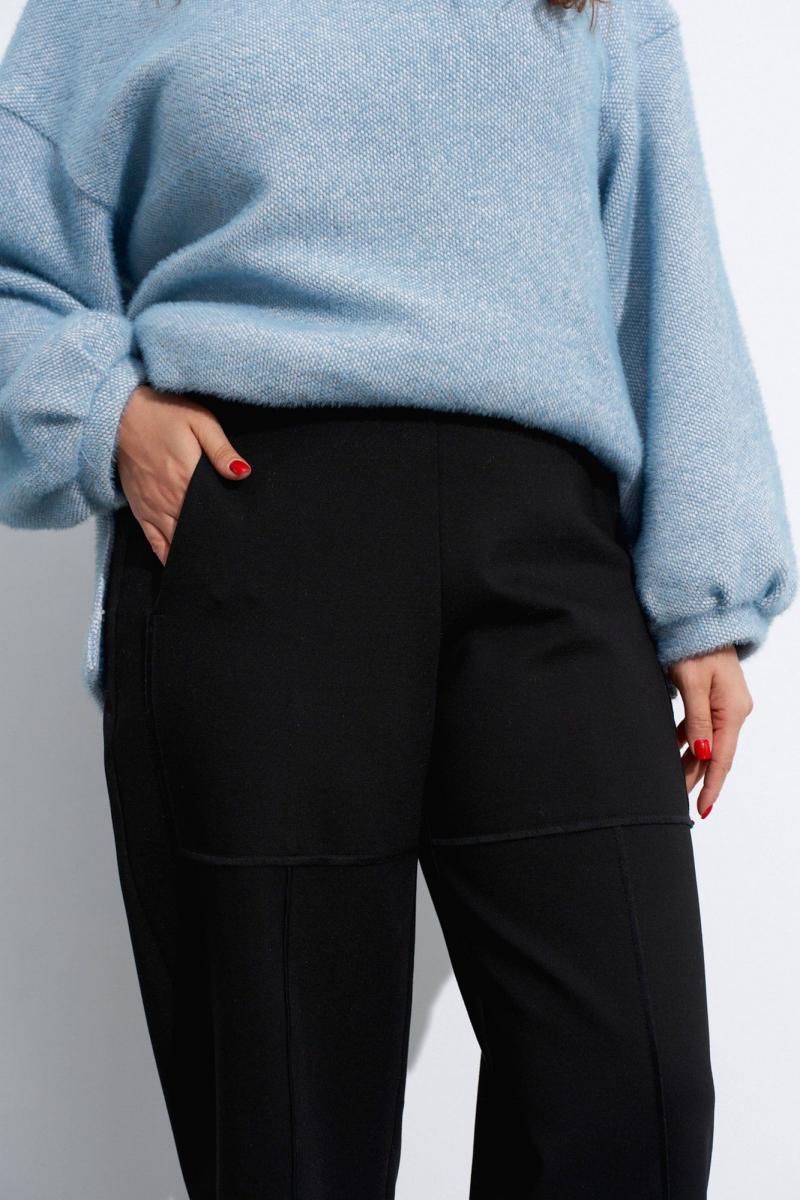Брюки трикотажные, укороченные, с накладными карманами спереди, без застёжки. Передние половины со средним швом и разрезом у низа. Швы спереди и срезы карманов выполнены открытыми, с обмёткой. Пояс притачной ,на эластичной тесьме.