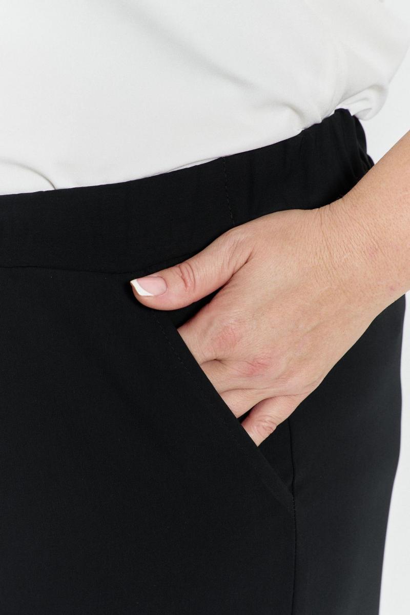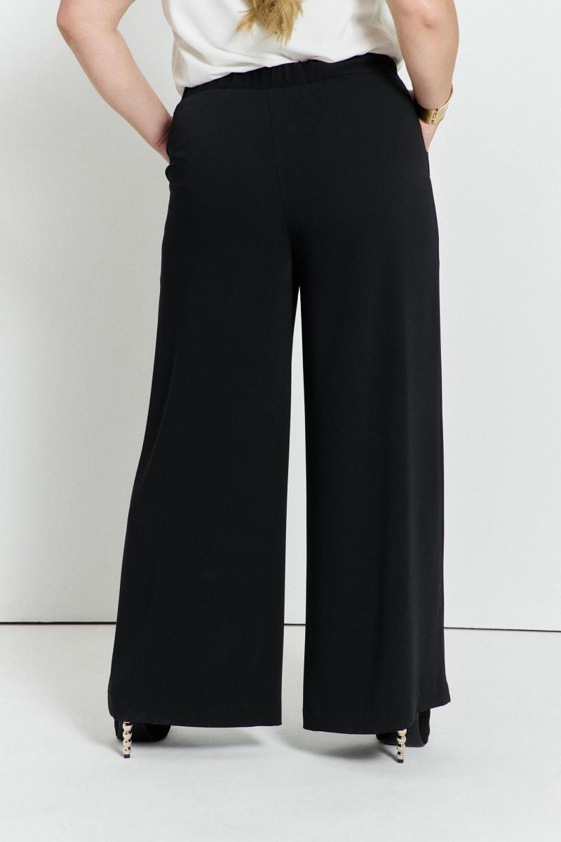 Прямые, широкие брюки с карманами спереди и на поясе с резинкой. Длина сбоку с поясом ок. 106 см.