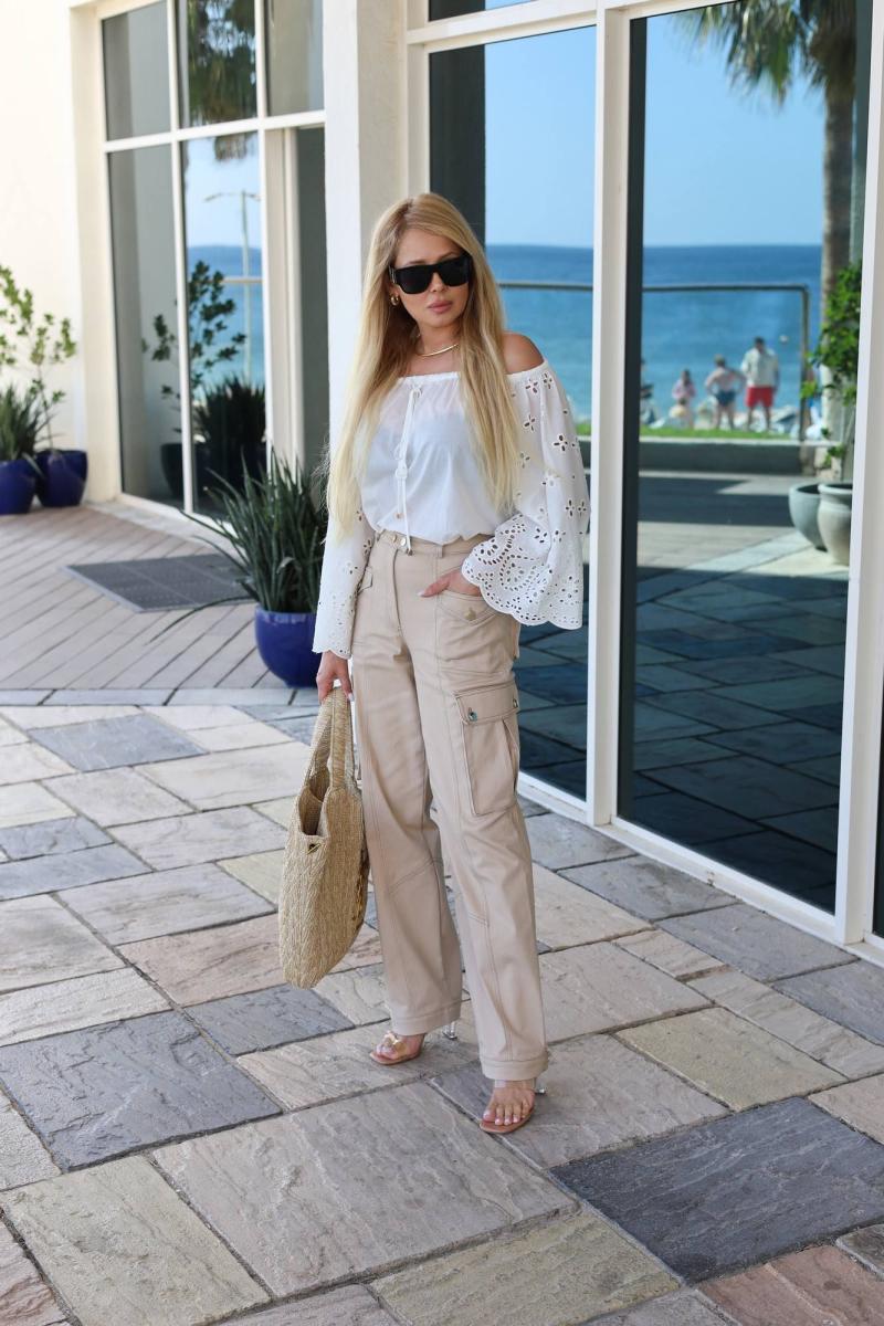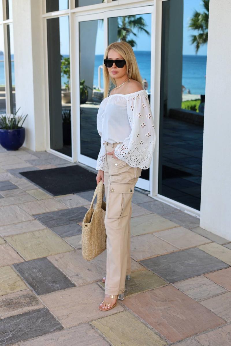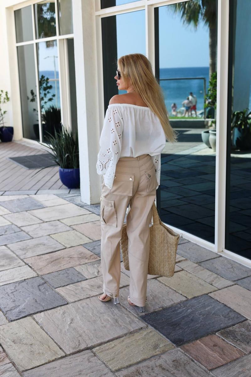 Брюки – карго из джинсовой ткани с широкими брючинами. Верх на притачном поясе.  Застёжка на металлическую молнию, на петлю и пуговицу-болт.  Спереди и сзади накладные карманы-портфели. Низ брюк   на  манжете, пата регулируется  на петлю и пуговицы.