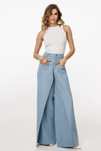 Брюки прямые из джинсовой ткани со стразами. Верх на притачном поясе со шлевками. Застежка по переду на молнию и пуговицу на поясе. На переде боковые карманы. На задних частях кокетка и карманы.